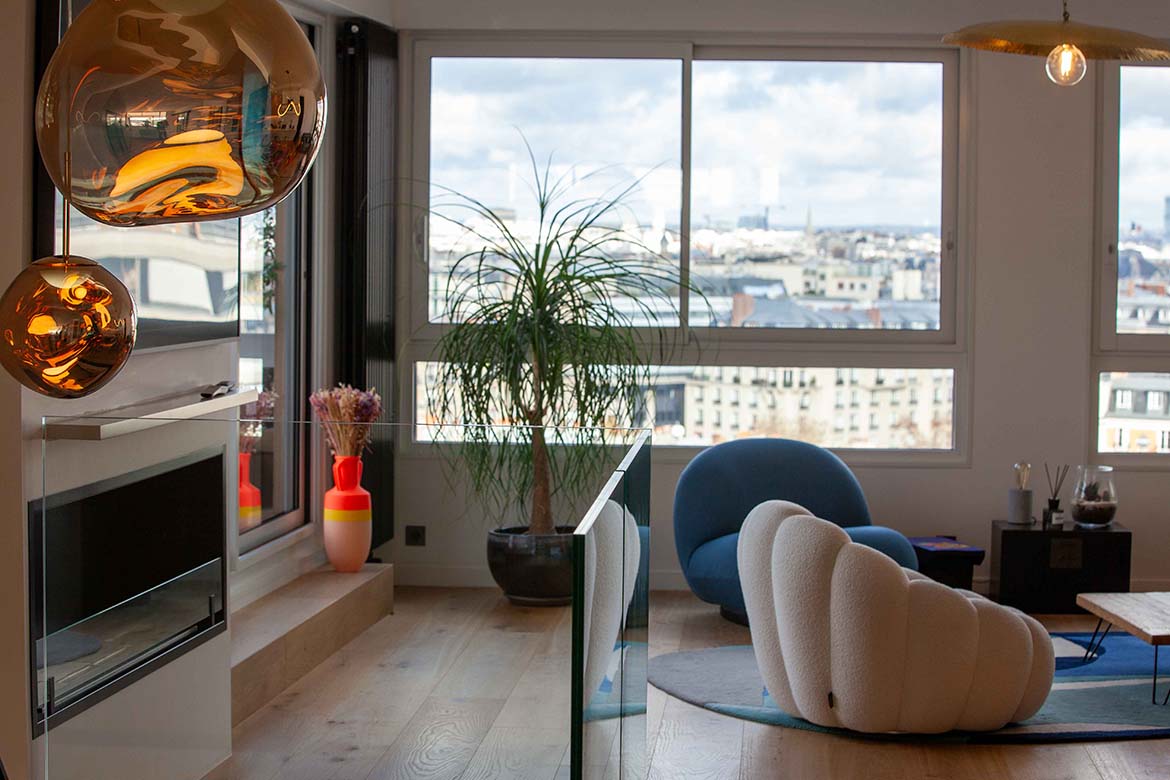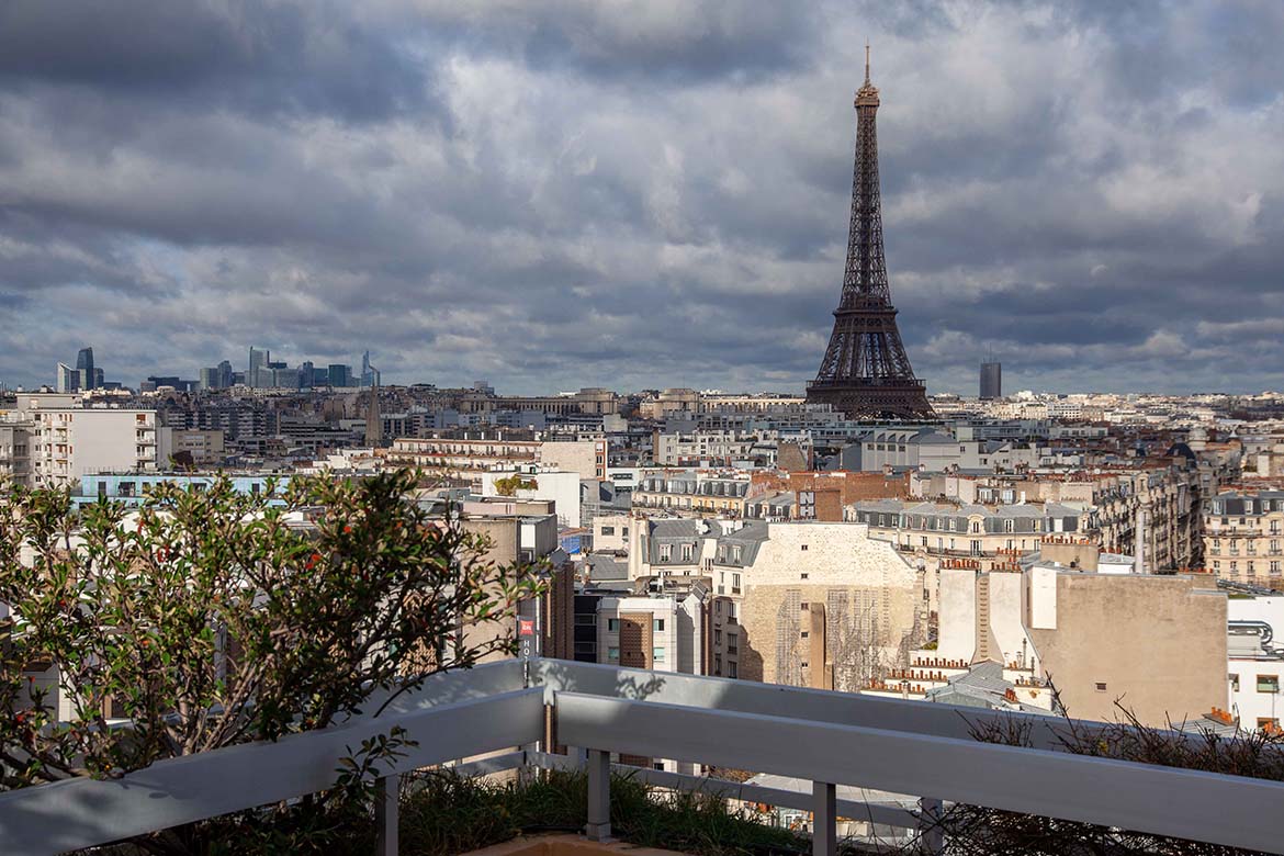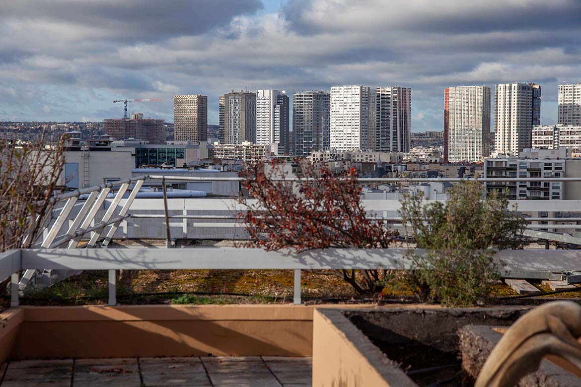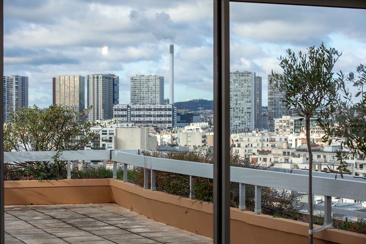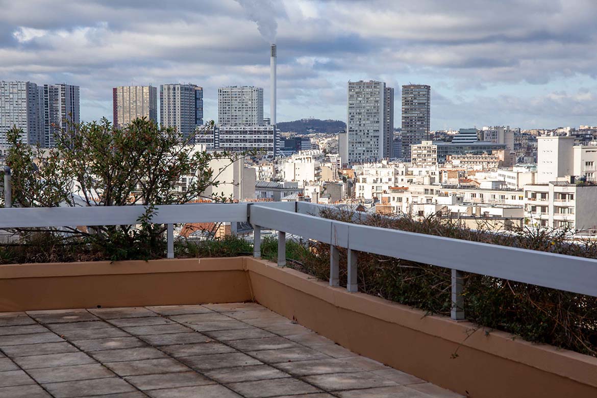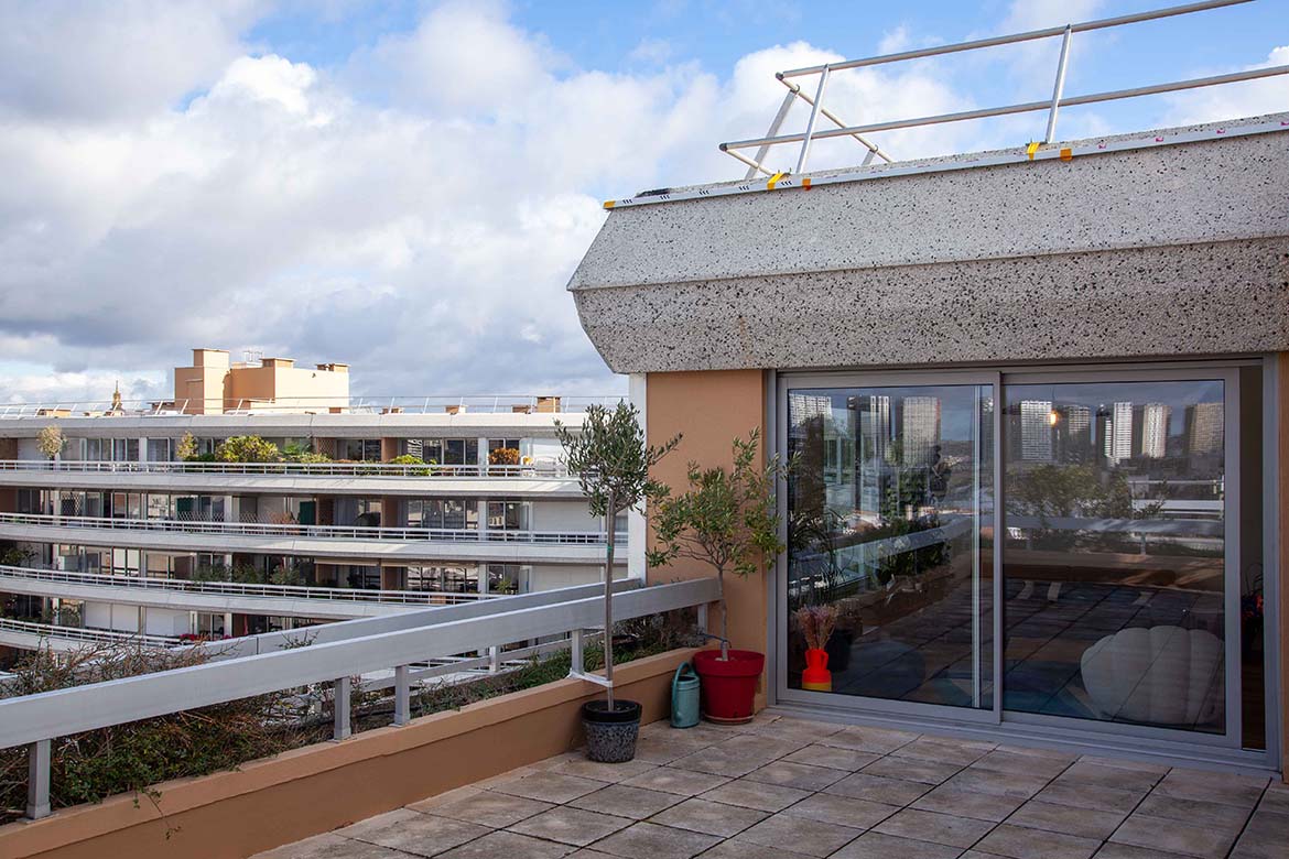 Appartement en duplex dans une résidence originale et emblématique des années 70. L’appartement est un écrin de douceur et de lumière. Il offre une belle terrasse avec vue sur les toits de Paris et sa majestueuse Tour Eiffel. Ce rooftop perché au 13e étage offre un temps suspendu.