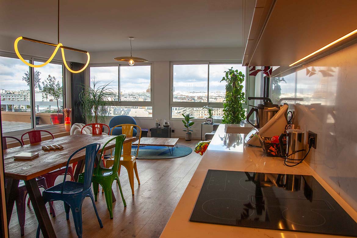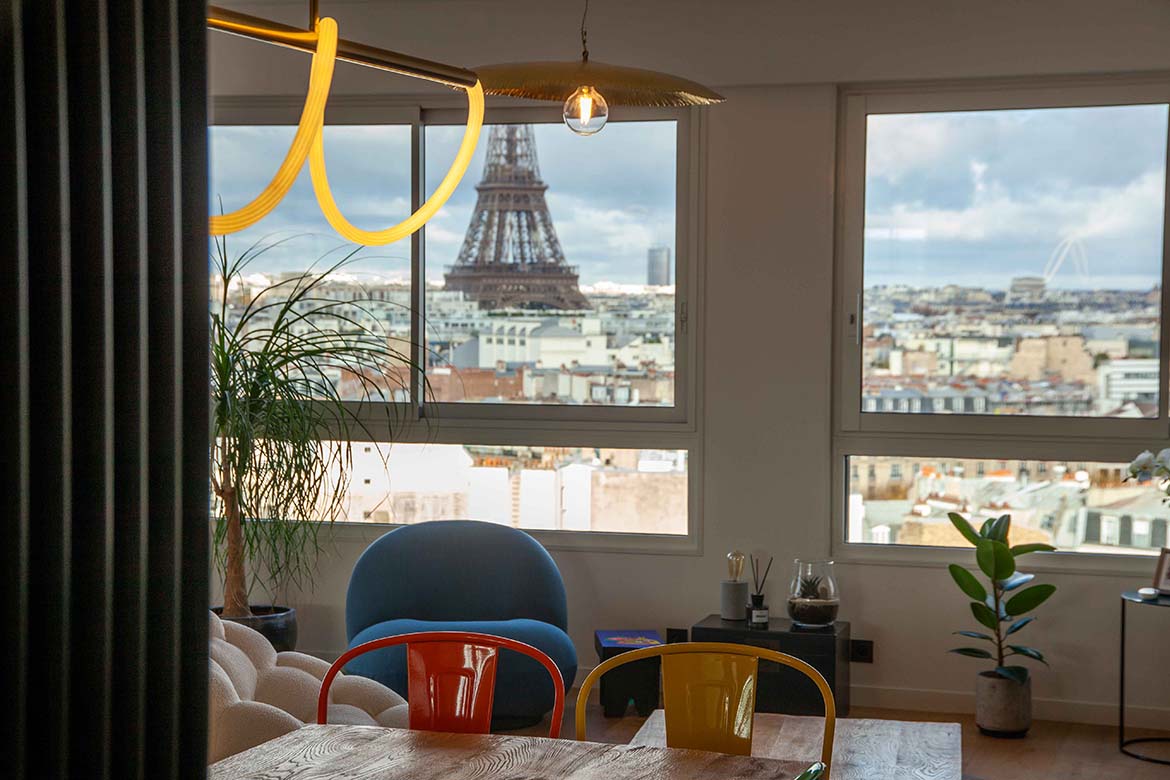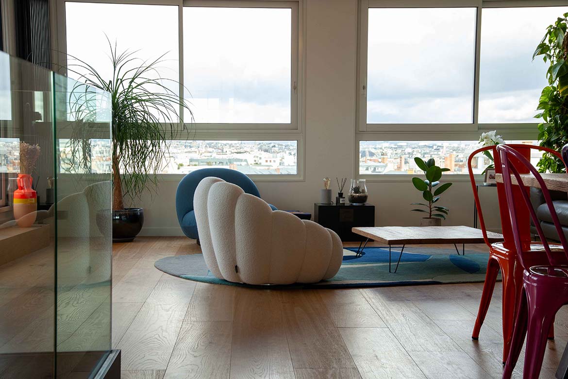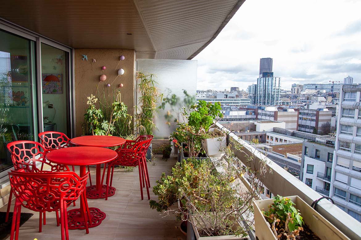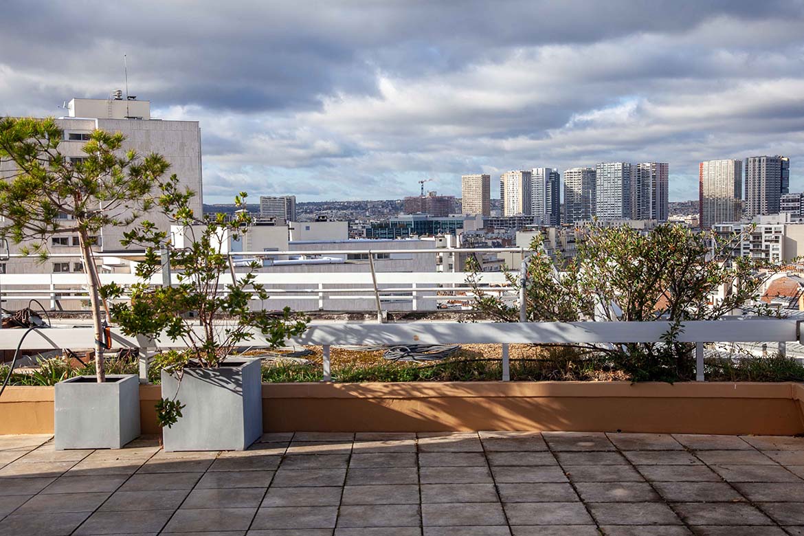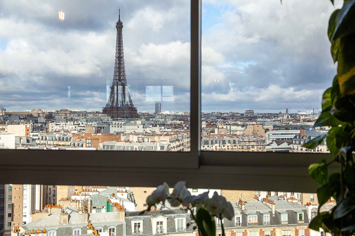 Appartement en duplex dans une résidence originale et emblématique des années 70. L’appartement est un écrin de douceur et de lumière. Il offre une belle terrasse avec vue sur les toits de Paris et sa majestueuse Tour Eiffel. Ce rooftop perché au 13e étage offre un temps suspendu.