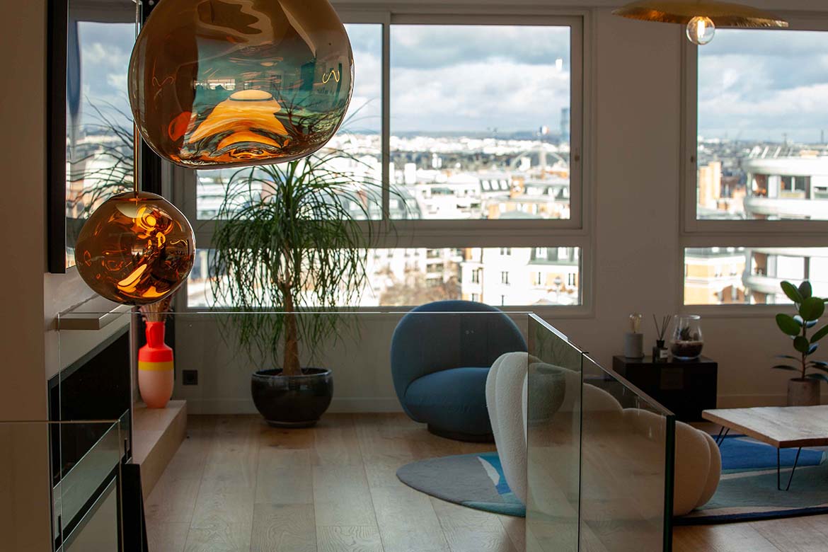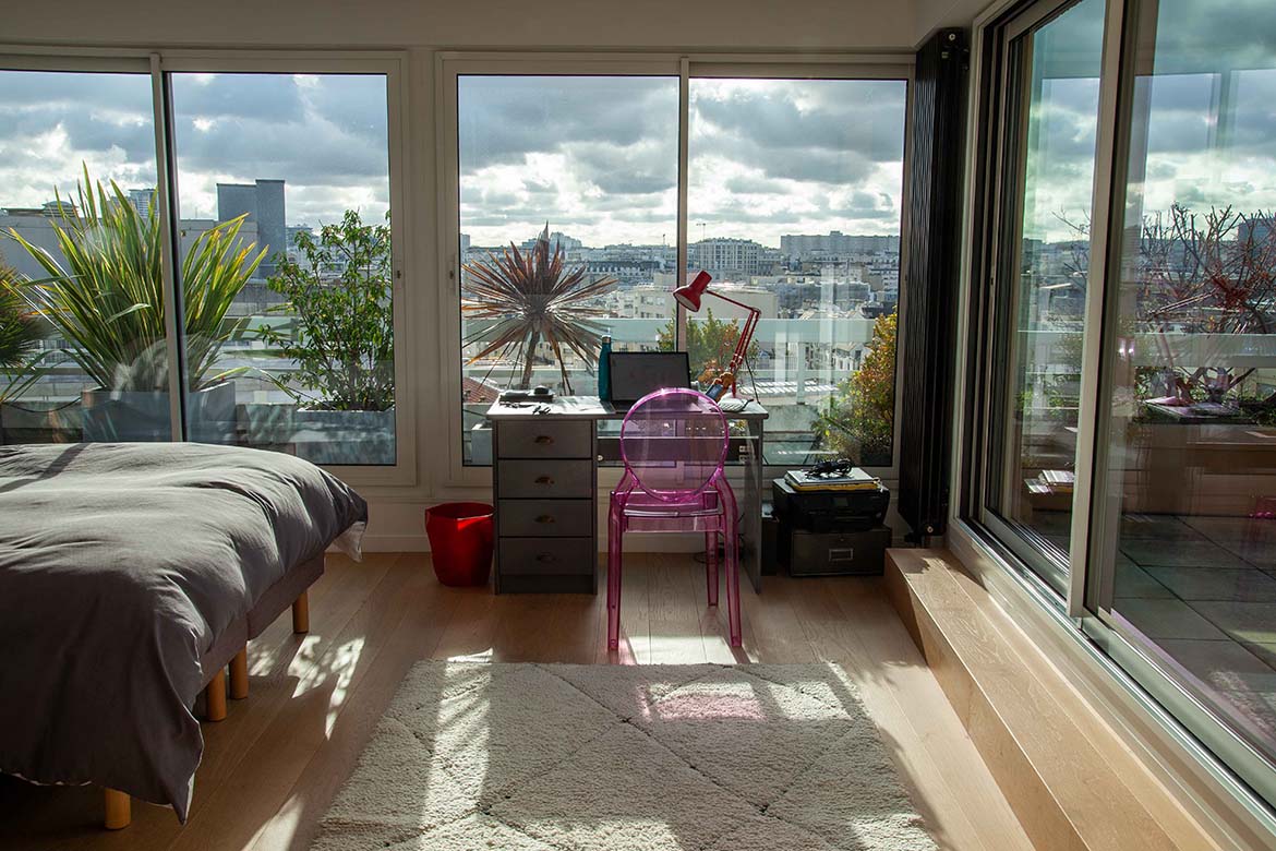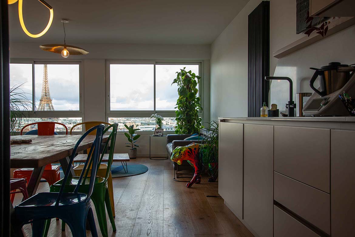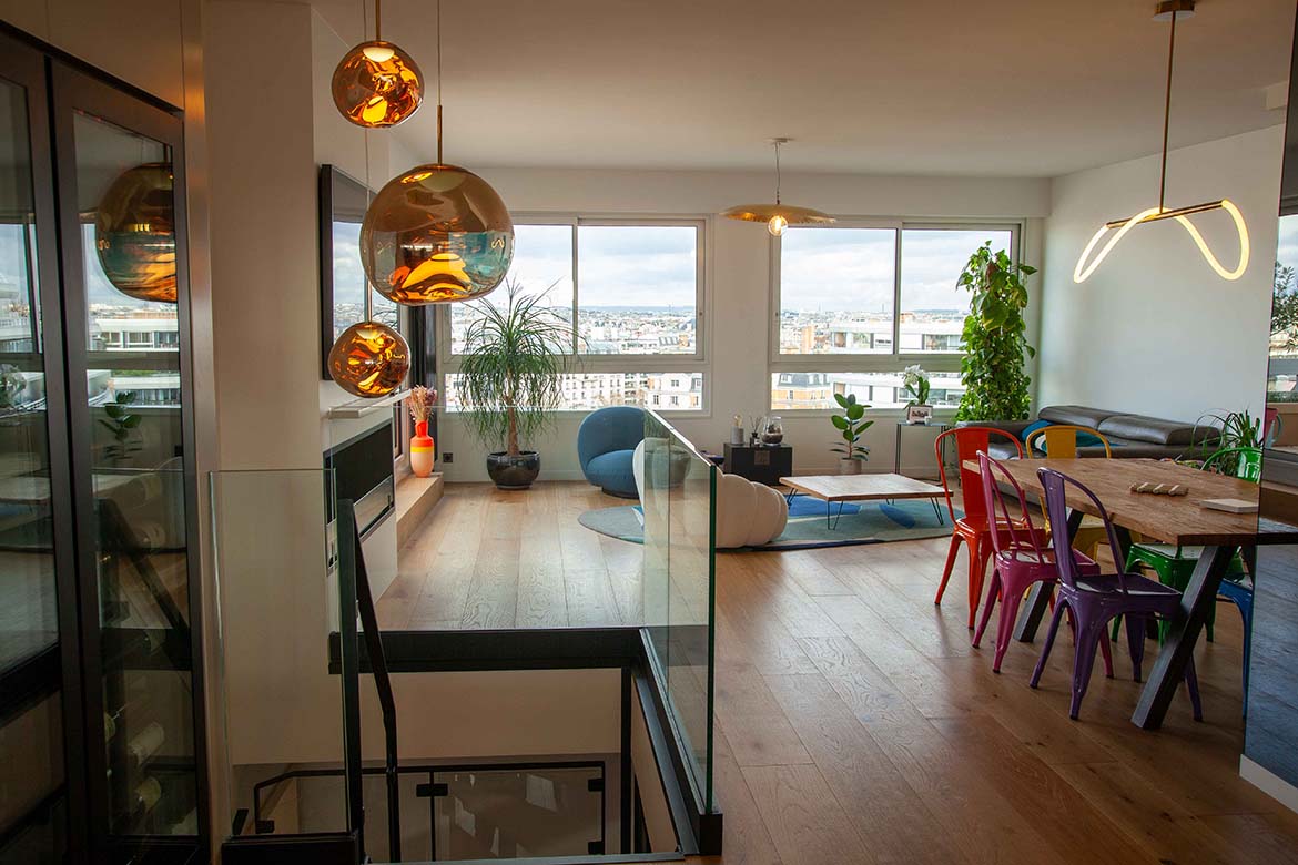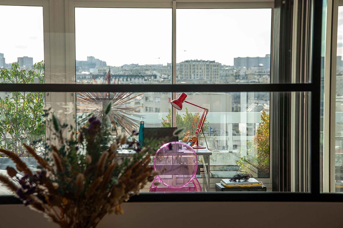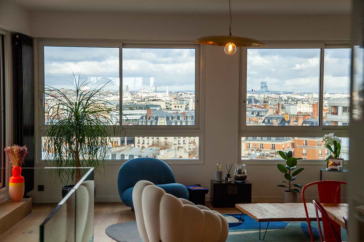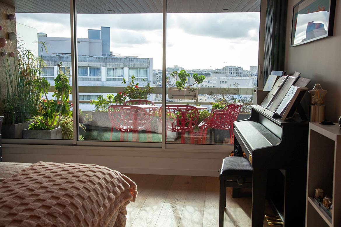 Appartement en duplex dans une résidence originale et emblématique des années 70. L’appartement est un écrin de douceur et de lumière. Il offre une belle terrasse avec vue sur les toits de Paris et sa majestueuse Tour Eiffel. Ce rooftop perché au 13e étage offre un temps suspendu.