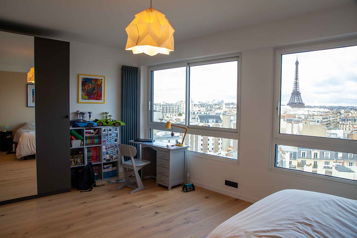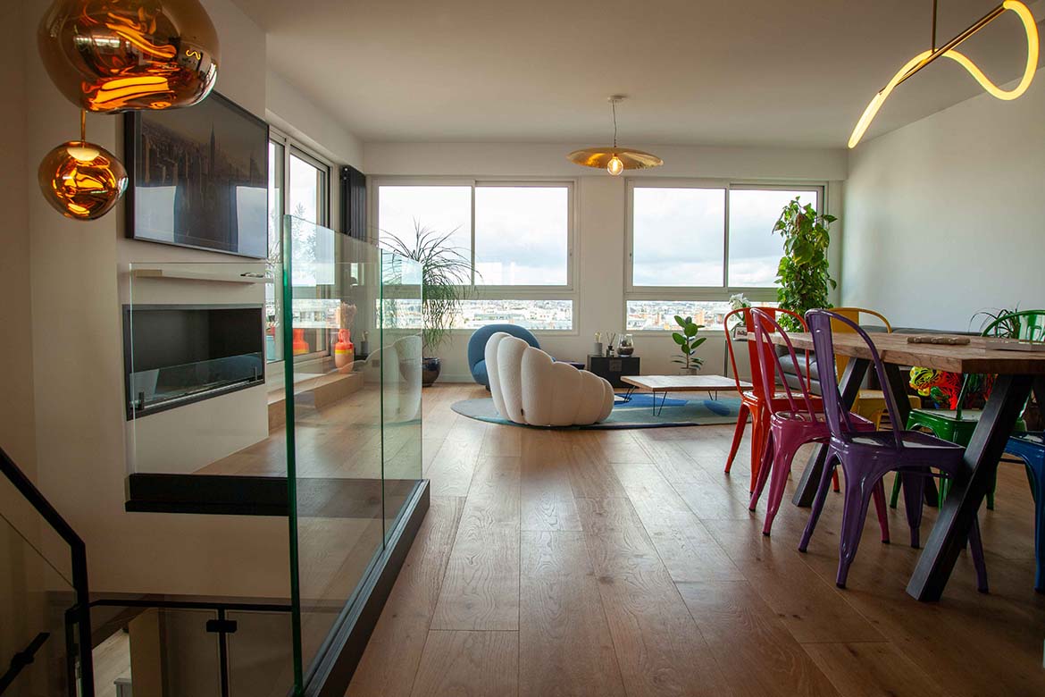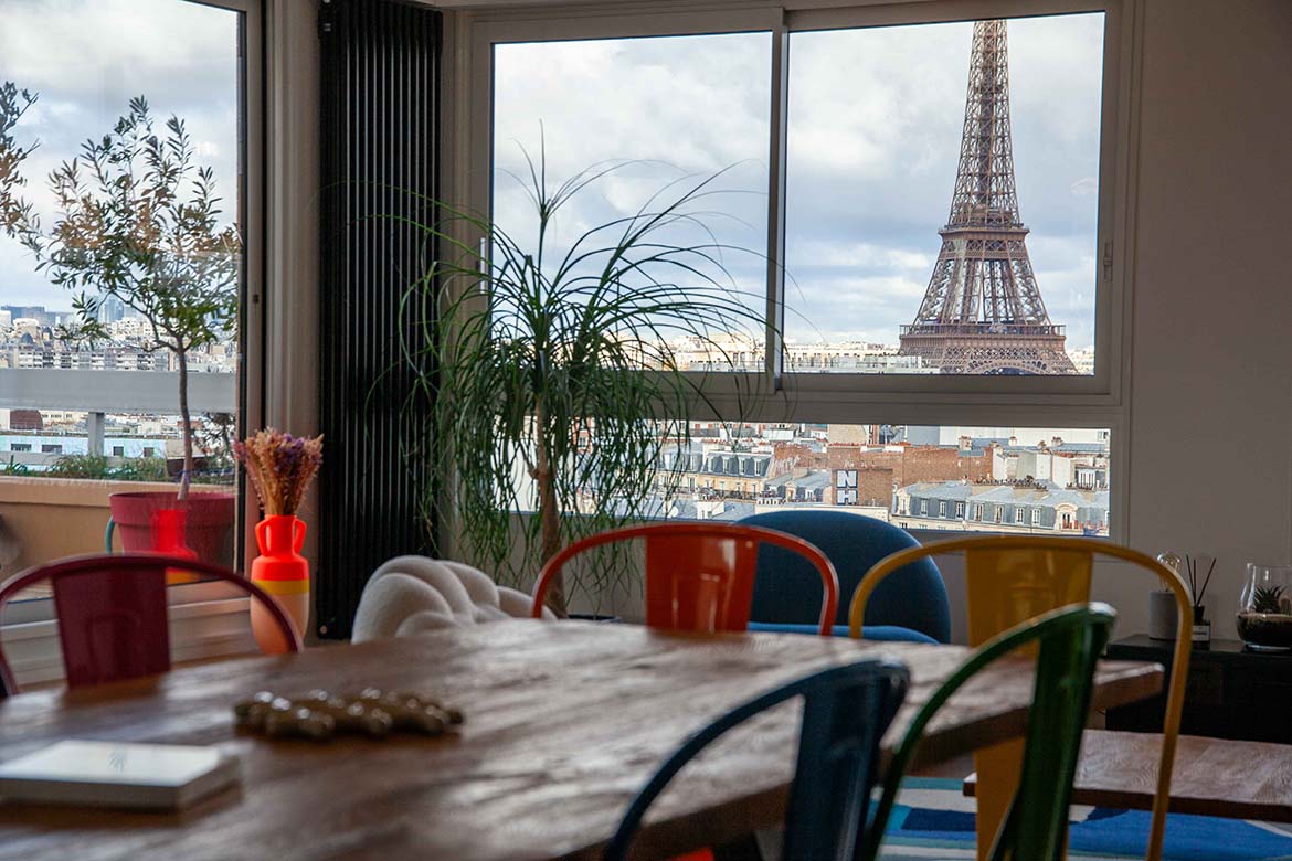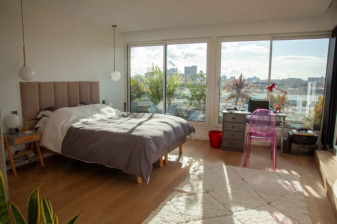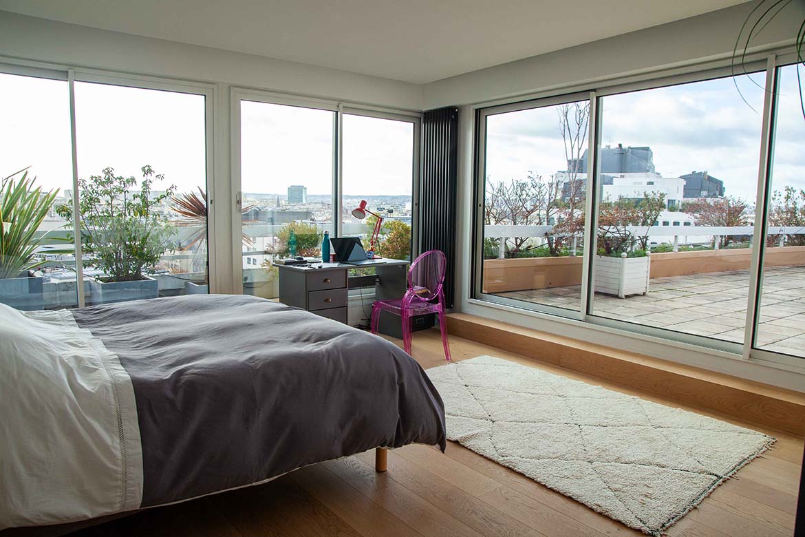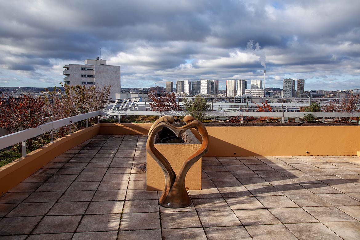 Appartement en duplex dans une résidence originale et emblématique des années 70. L’appartement est un écrin de douceur et de lumière. Il offre une belle terrasse avec vue sur les toits de Paris et sa majestueuse Tour Eiffel. Ce rooftop perché au 13e étage offre un temps suspendu.