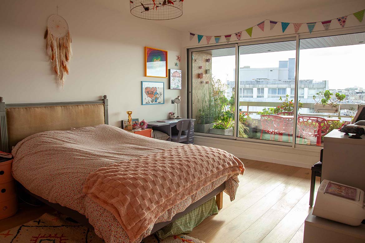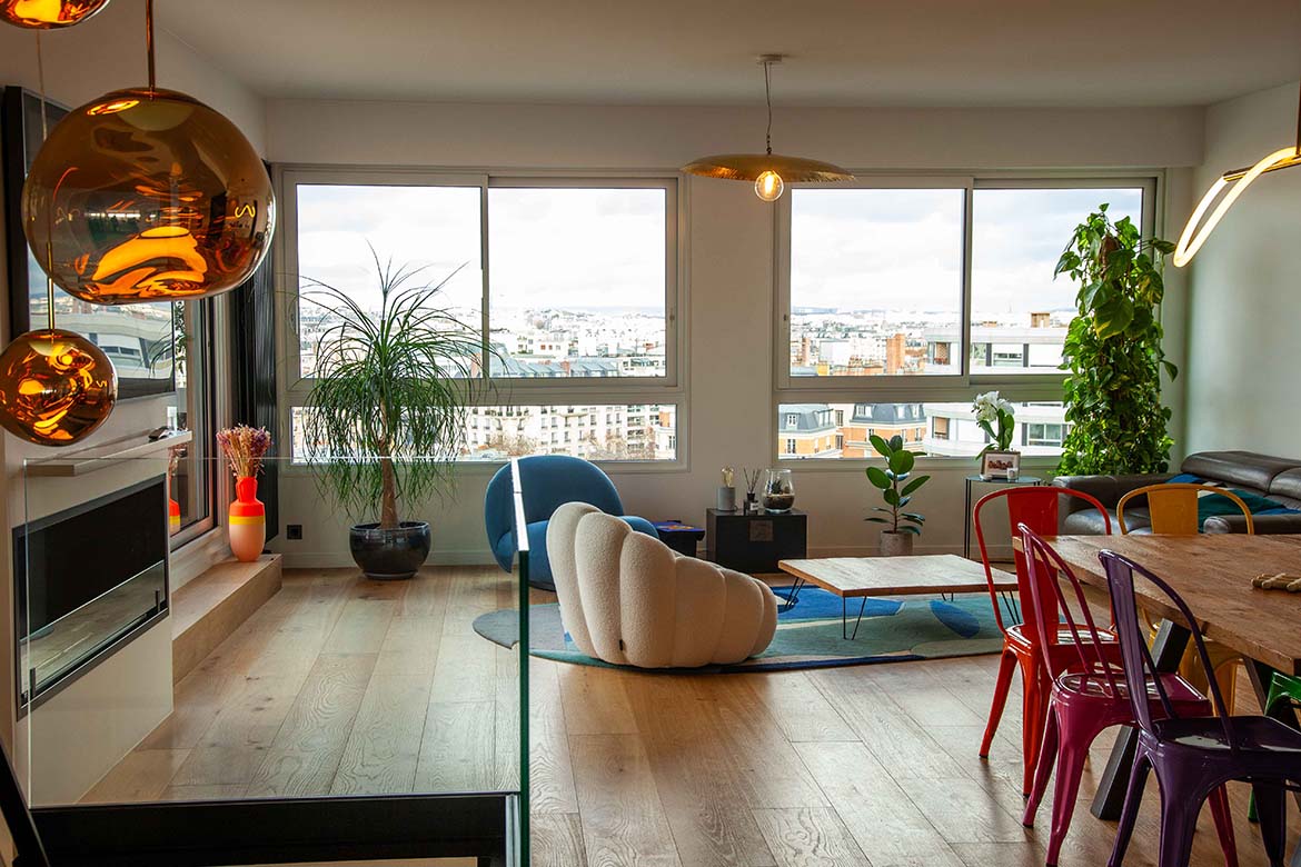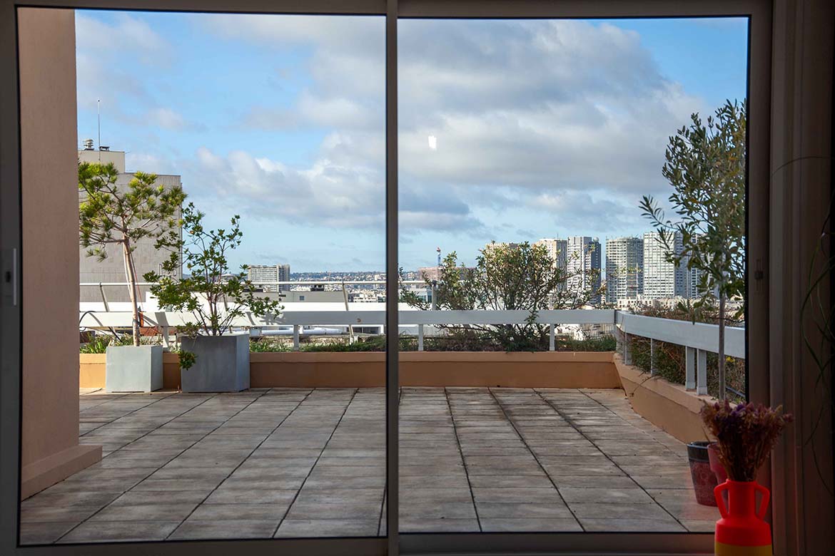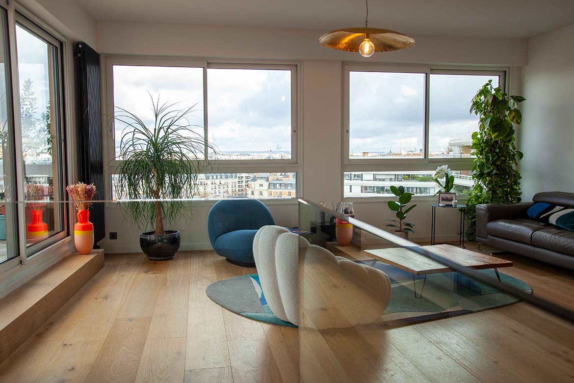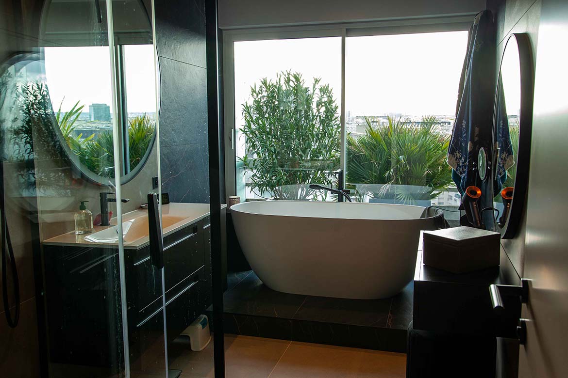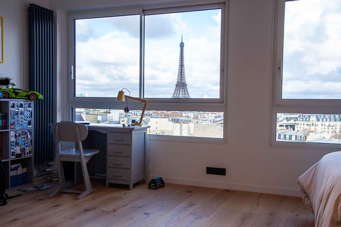 Appartement en duplex dans une résidence originale et emblématique des années 70. L’appartement est un écrin de douceur et de lumière. Il offre une belle terrasse avec vue sur les toits de Paris et sa majestueuse Tour Eiffel. Ce rooftop perché au 13e étage offre un temps suspendu.