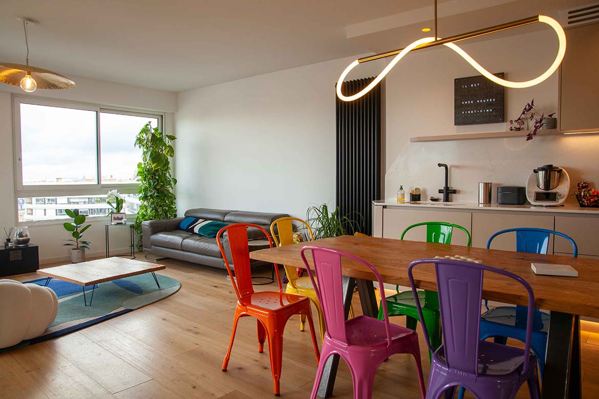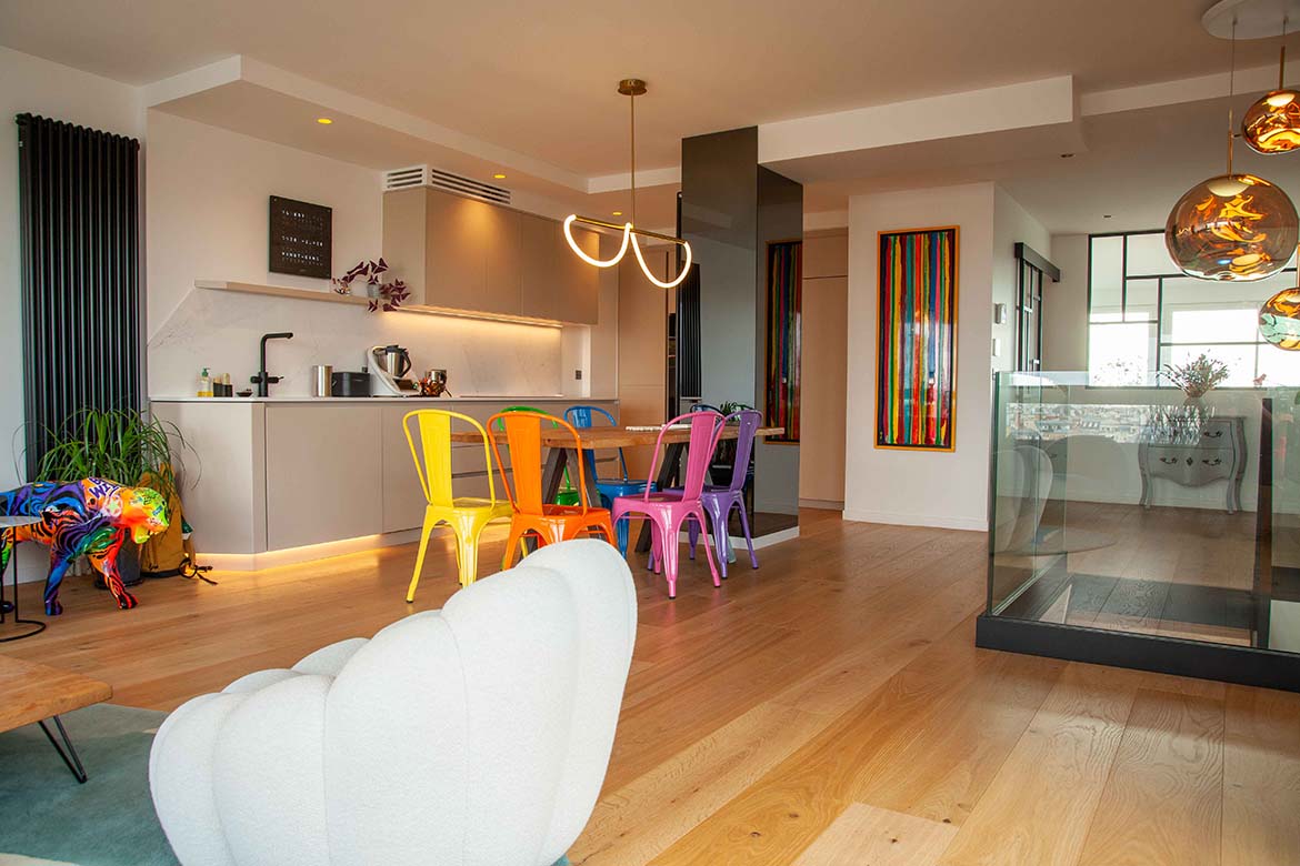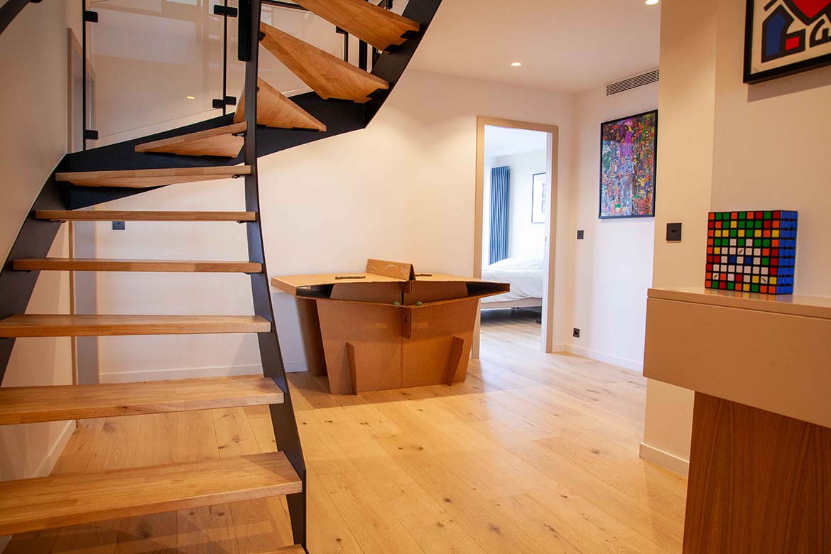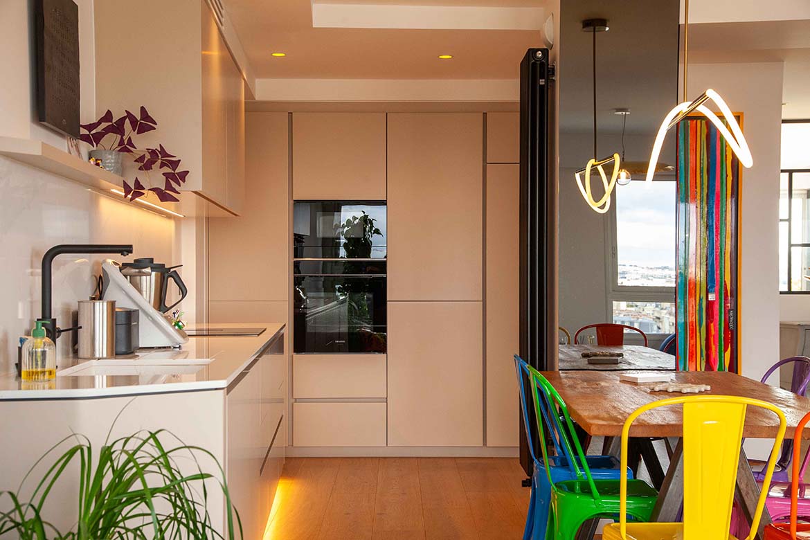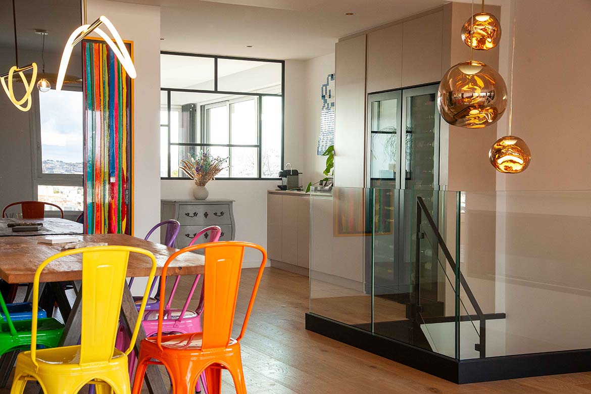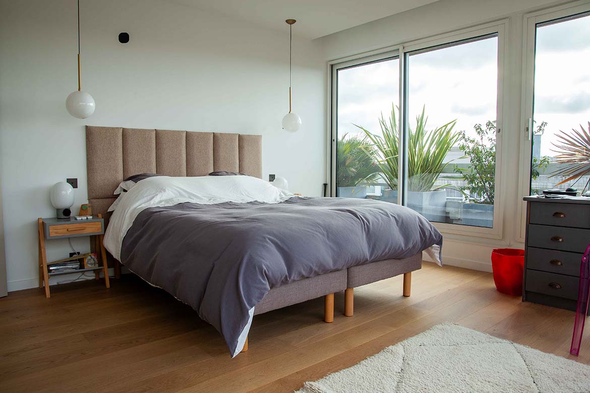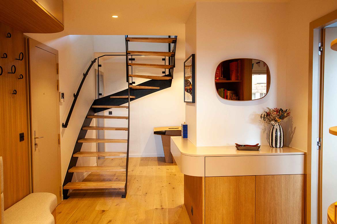 Appartement en duplex dans une résidence originale et emblématique des années 70. L’appartement est un écrin de douceur et de lumière. Il offre une belle terrasse avec vue sur les toits de Paris et sa majestueuse Tour Eiffel. Ce rooftop perché au 13e étage offre un temps suspendu.