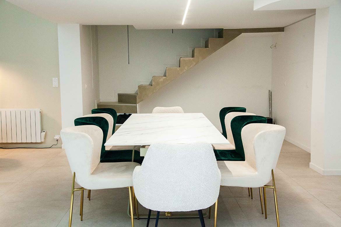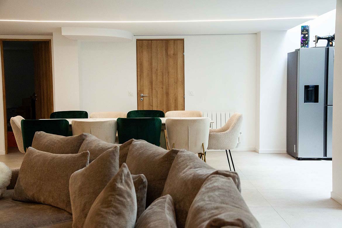 • Murs blancs et poutres béton blanches, offrant une excellente base neutre pour toutes les ambiances visuelles