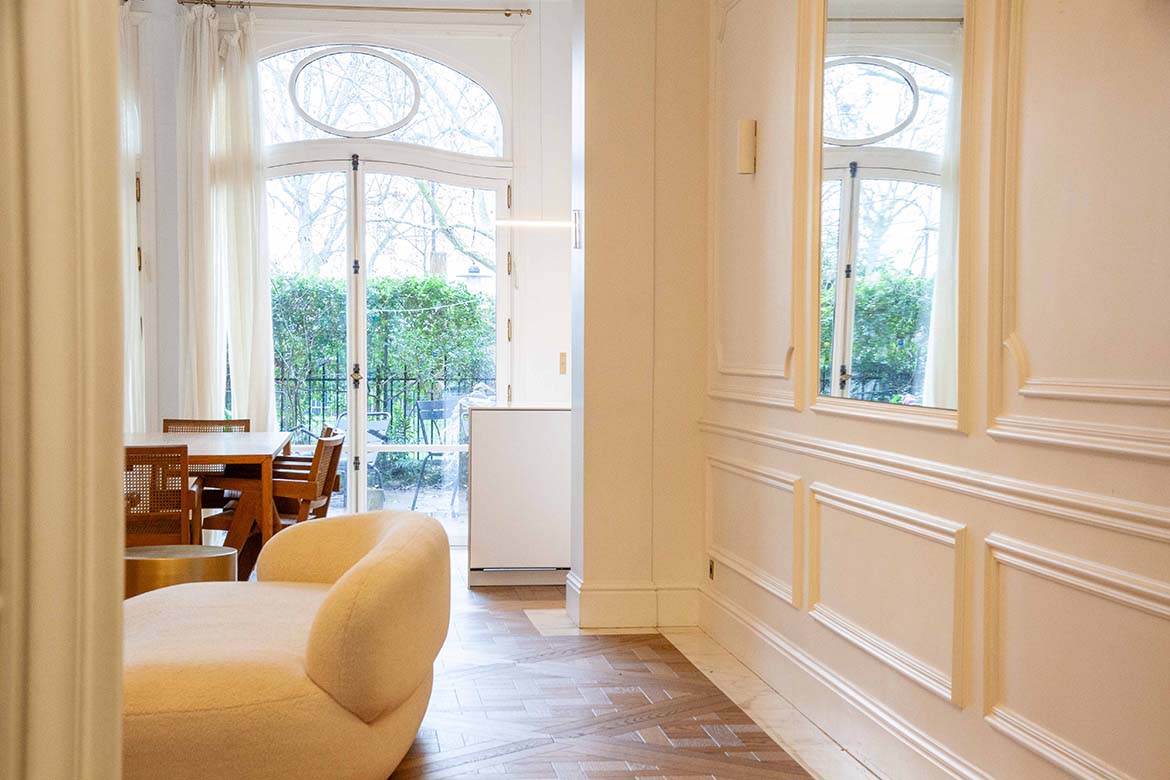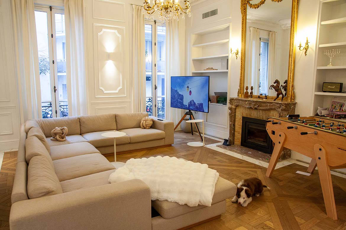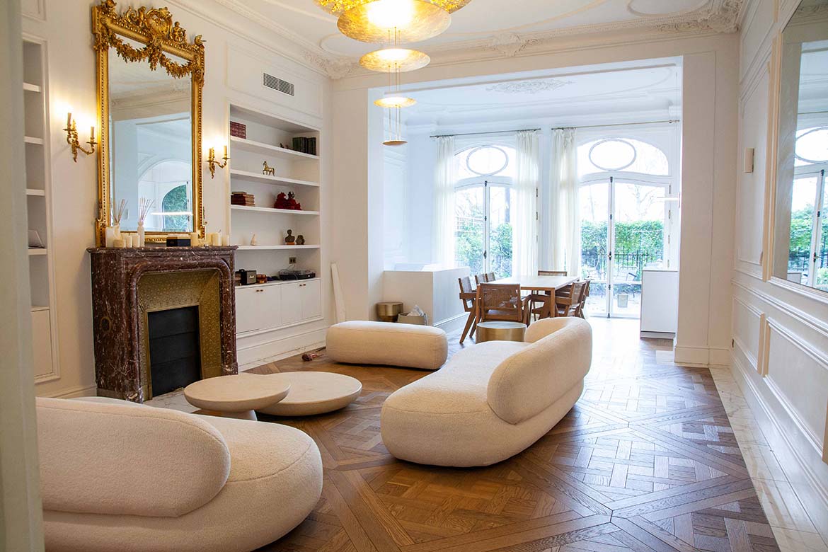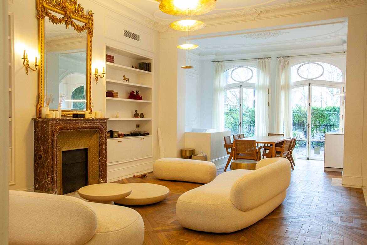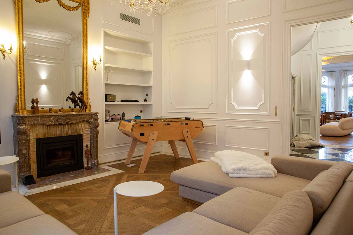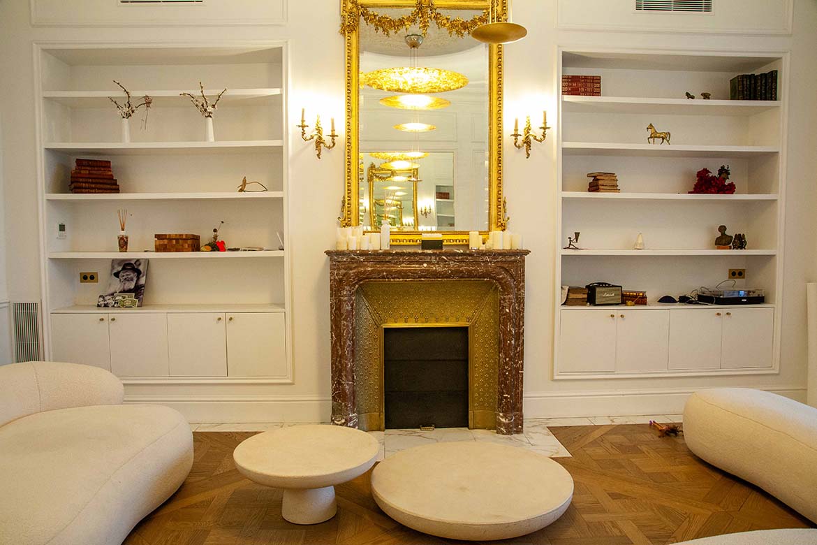 Dans le très chic 16ᵉ arrondissement de Paris, au cœur d’une voie privée classée au patrimoine — où se dresse l’immeuble de Marcel Pagnol, mais également des artistes, familles royales et écrivains — ce somptueux appartement haussmannien de 280 m² marie avec élégance le cachet historique et une esthétique contemporaine minimaliste. Ce triplex d’exception, rare et sophistiqué, est idéal pour vos productions audiovisuelles, shootings de mode, publicités haut de gamme ou événements exclusifs. Le rez-de-chaussée comprend un grand salon avec cheminée, moulures et miroir doré, ouvert sur une cuisine, salle à manger baignées de lumière, avec accès à une terrasse végétalisée. Un salon TV dans l’enfilade de l’entrée complète les espaces de réception.