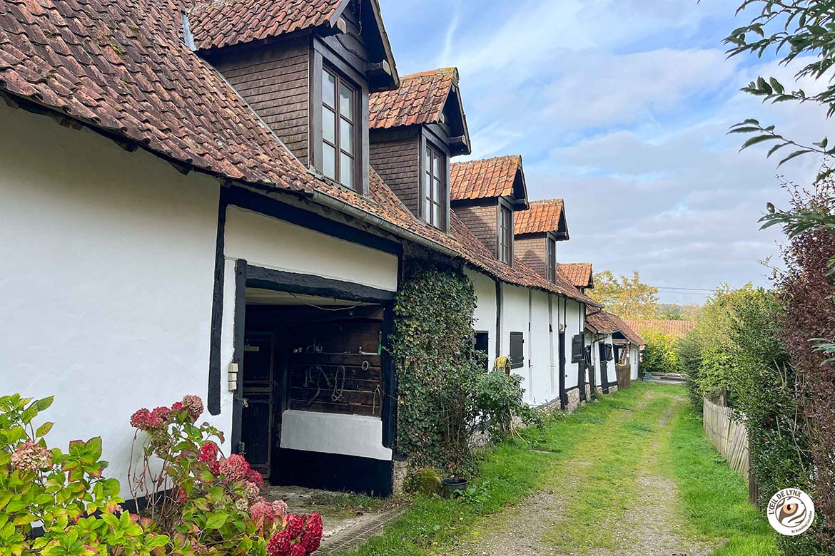 Haras niché sur la Côte d’Opale. Ce lieu est un ensemble de 25 hectares de prairies bocagères entourées de haies d’aubépine dédié à l’élevage de chevaux pur sang. Au cœur figurent deux longères du XVIII ème (d’environ 180 m2, chacune) et une petite dépendance ceintes de jardins fleuris du printemps à l’automne, clos de haies ou de murs d’à peu près 2000 m2. S’ajoutent des écuries de caractère et des bâtiments d’exploitation agricole. Les maisons modestes ont gardé leur charme d’antan, notamment au travers de leurs vitres à petits carreaux, leurs vastes cheminées à foyer ouvert et leurs charpentes apparentes en orme.Des bâtiments annexes tels que grenier, garages, bibliothèque complètent l’ensemble.