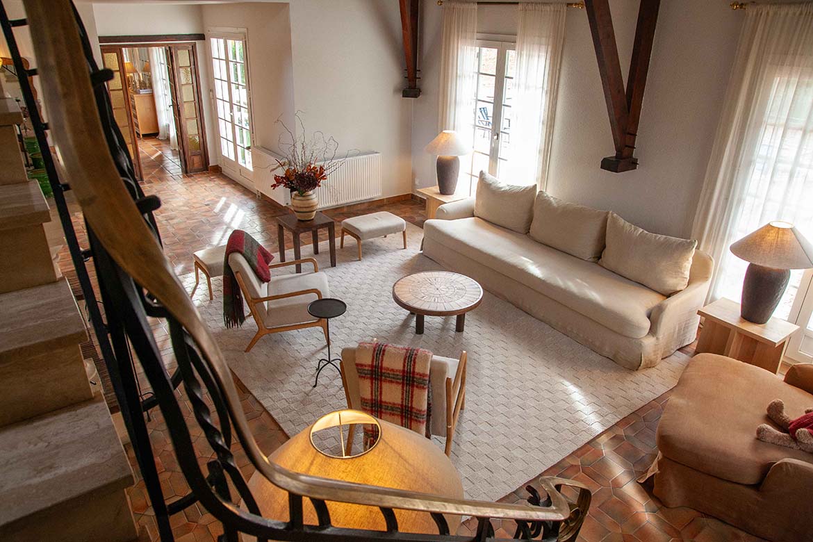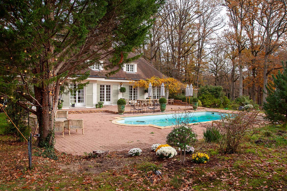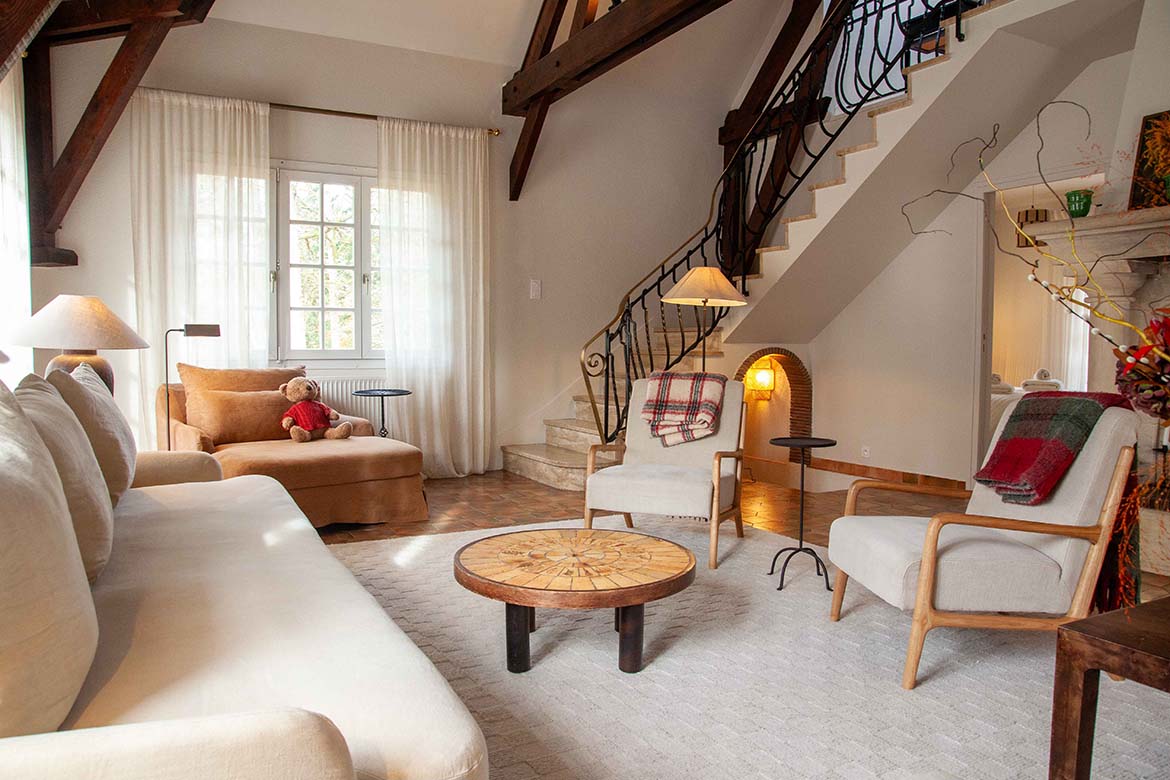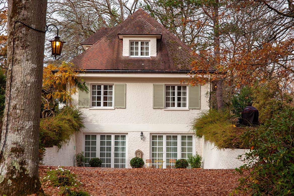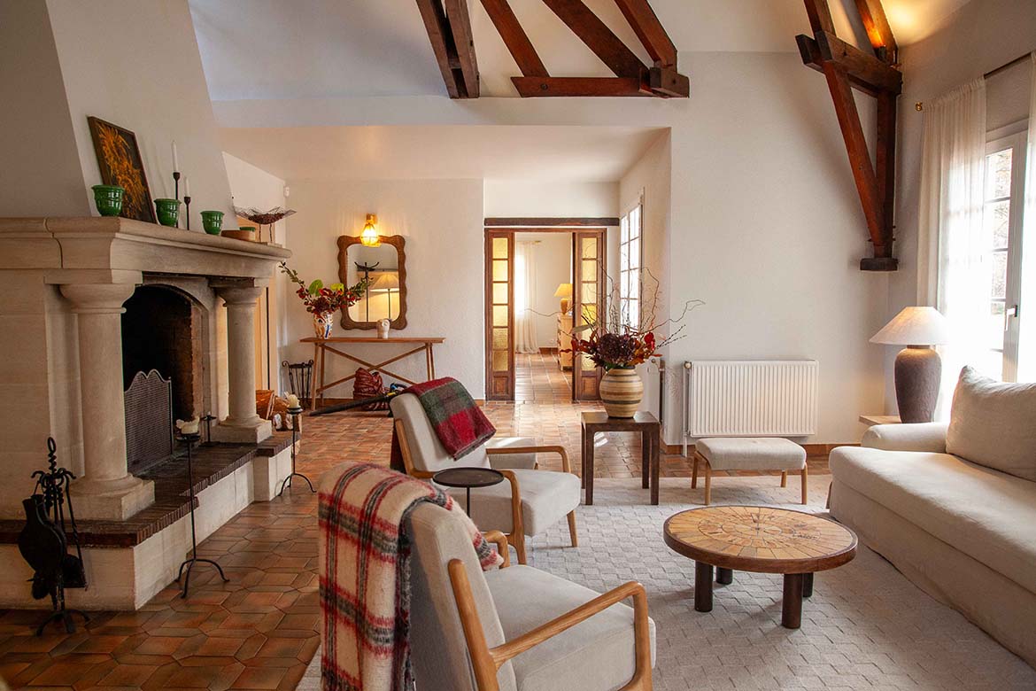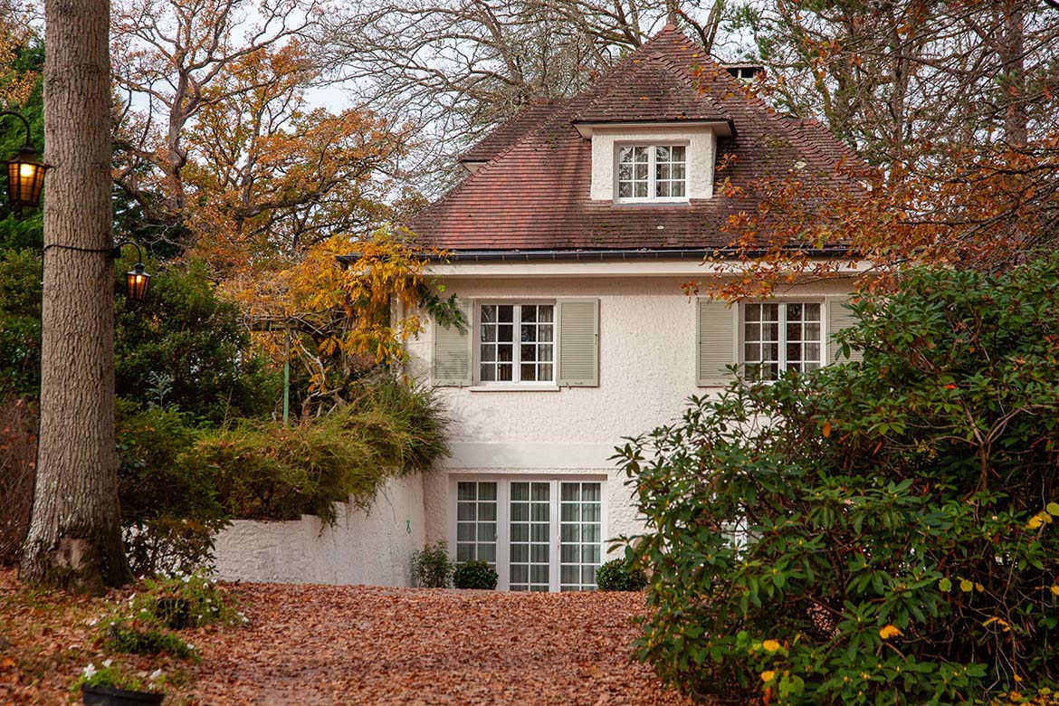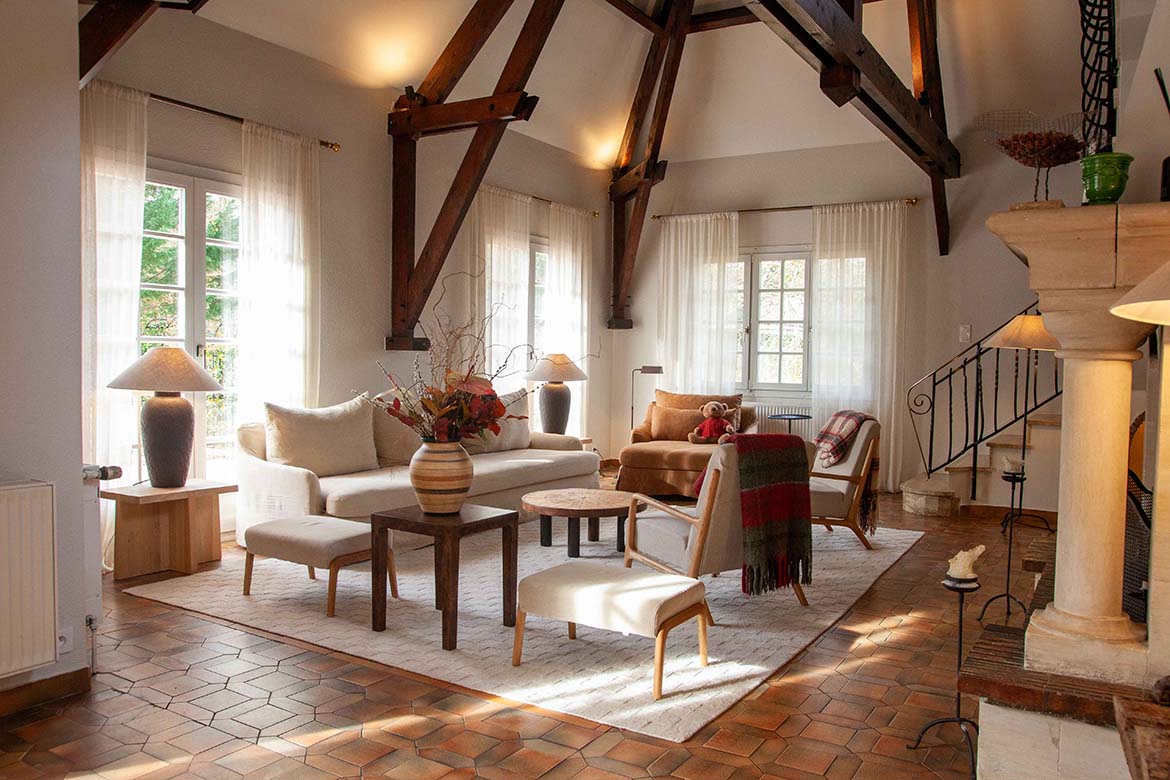 Nous avons découvert les Vaux de Cernay un matin de décembre, juste après un séjour de Noël à l’Abbaye. L’abbaye était encore plongée dans l’ambiance des fêtes : décorations, chaleur du bois, et ce calme particulier propre à l’hiver en forêt. En repartant, il faisait un soleil incroyable pour la saison. La rosée du matin recouvrait encore le sol, et les rayons traversaient les arbres de la forêt domaniale de Rambouillet, donnant à la route une lumière presque cinématographique. Lorsque nous sommes arrivés à la maison, la première chose qui frappe, c’est le terrain. L’espace. Les grands arbres. La façon dont la maison est posée dans la nature, avec la forêt tout autour. On sent immédiatement une respiration, une ouverture, quelque chose de rare si proche de Paris.
