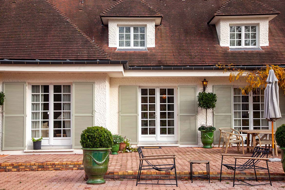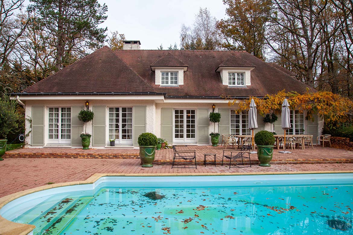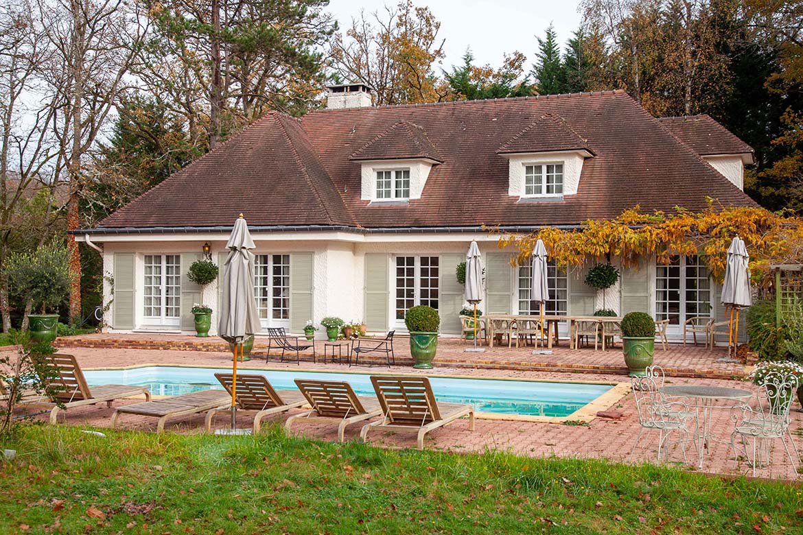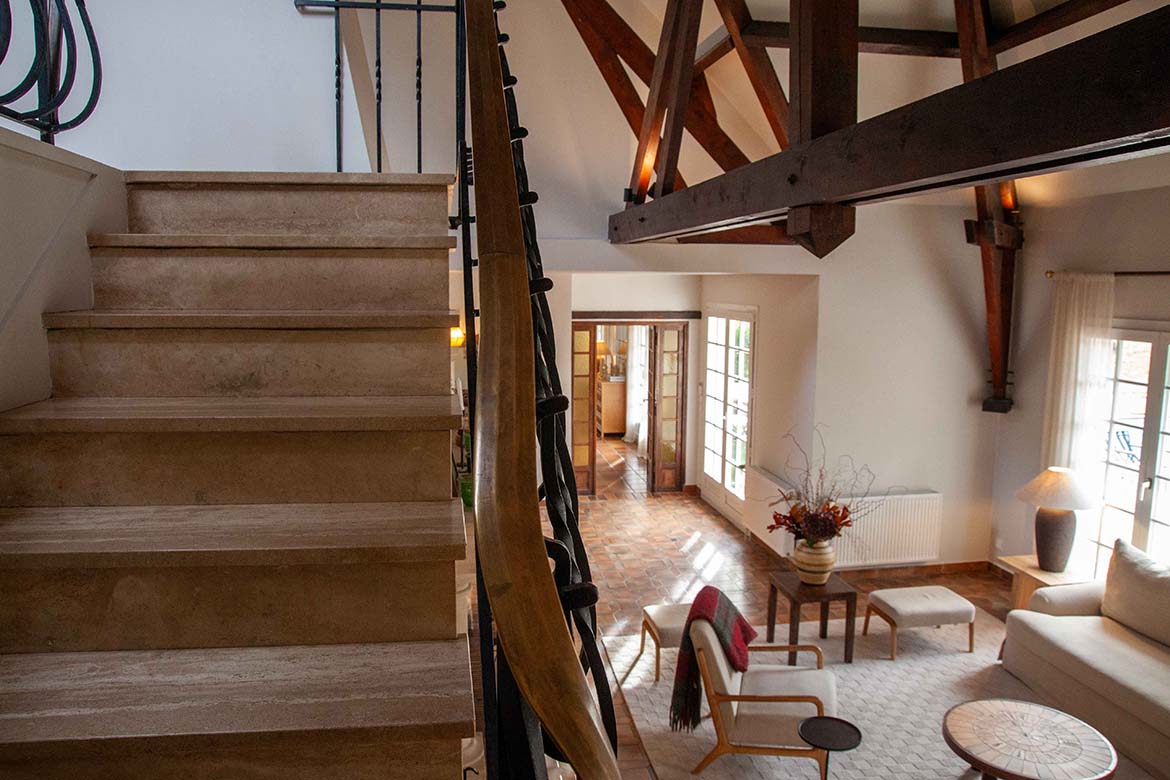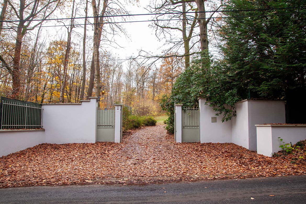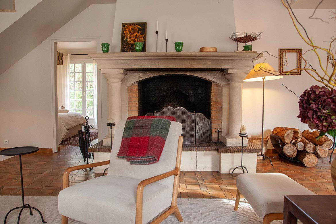 Nous avons découvert les Vaux de Cernay un matin de décembre, juste après un séjour de Noël à l’Abbaye. L’abbaye était encore plongée dans l’ambiance des fêtes : décorations, chaleur du bois, et ce calme particulier propre à l’hiver en forêt. En repartant, il faisait un soleil incroyable pour la saison. La rosée du matin recouvrait encore le sol, et les rayons traversaient les arbres de la forêt domaniale de Rambouillet, donnant à la route une lumière presque cinématographique. Lorsque nous sommes arrivés à la maison, la première chose qui frappe, c’est le terrain. L’espace. Les grands arbres. La façon dont la maison est posée dans la nature, avec la forêt tout autour. On sent immédiatement une respiration, une ouverture, quelque chose de rare si proche de Paris.