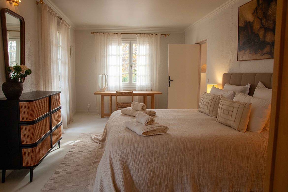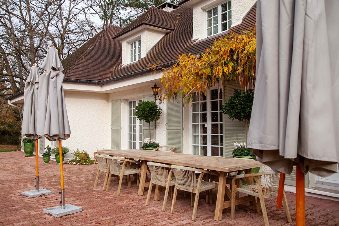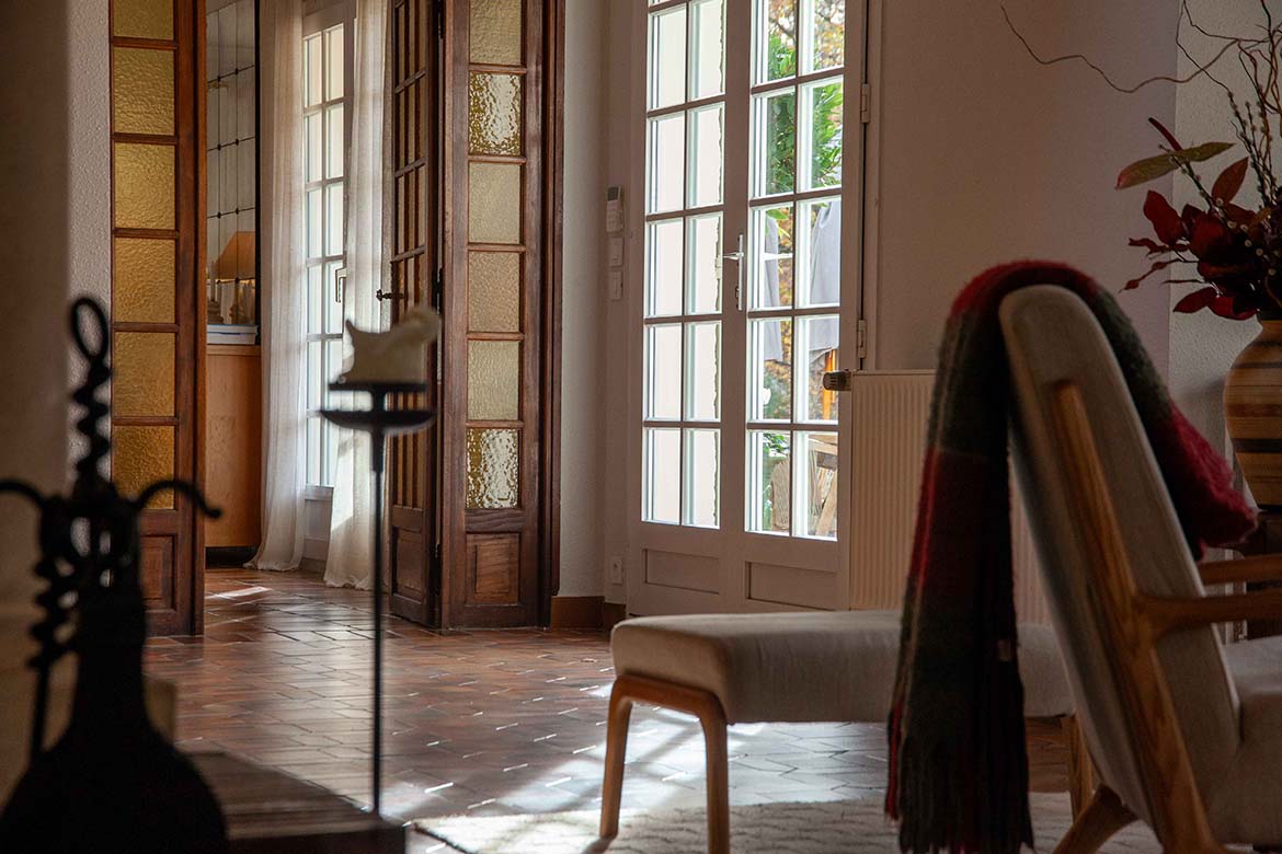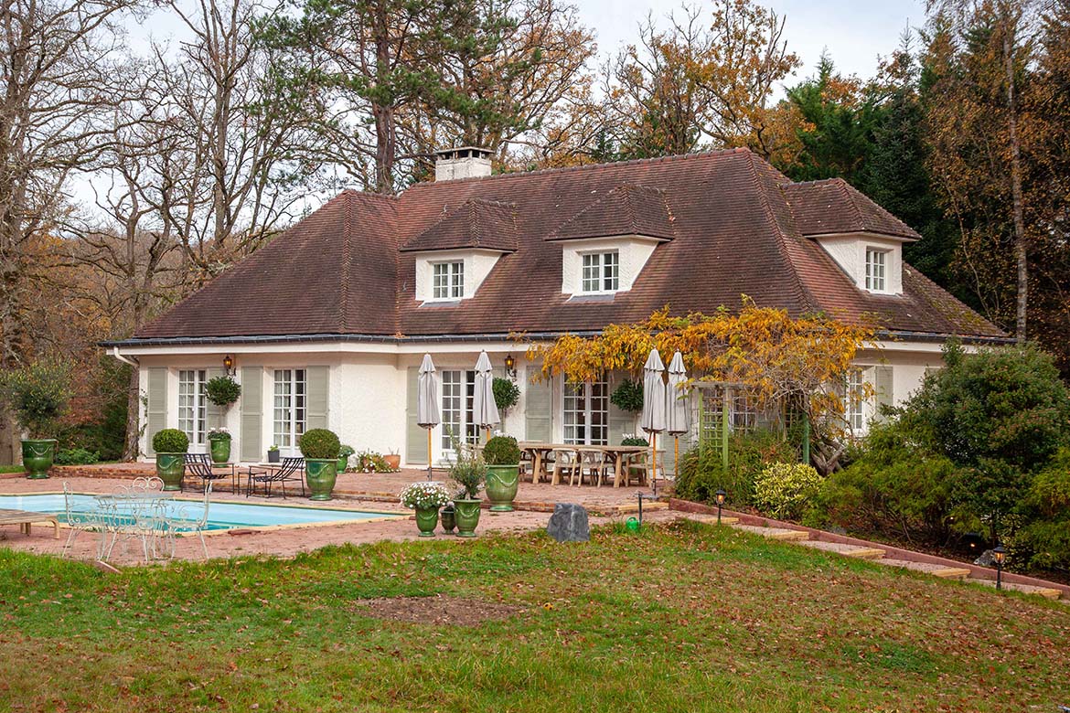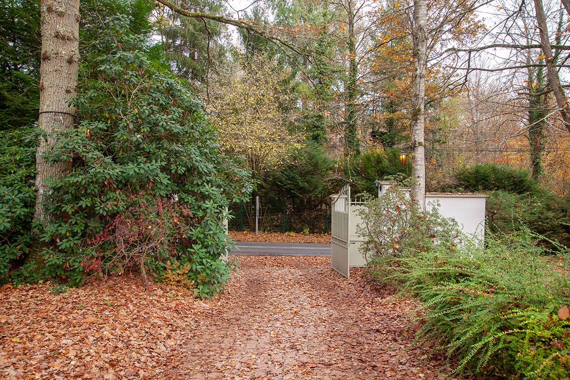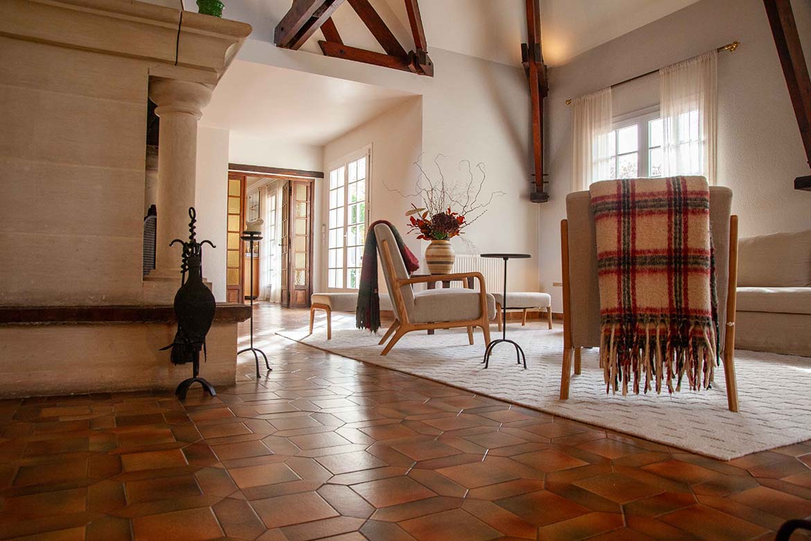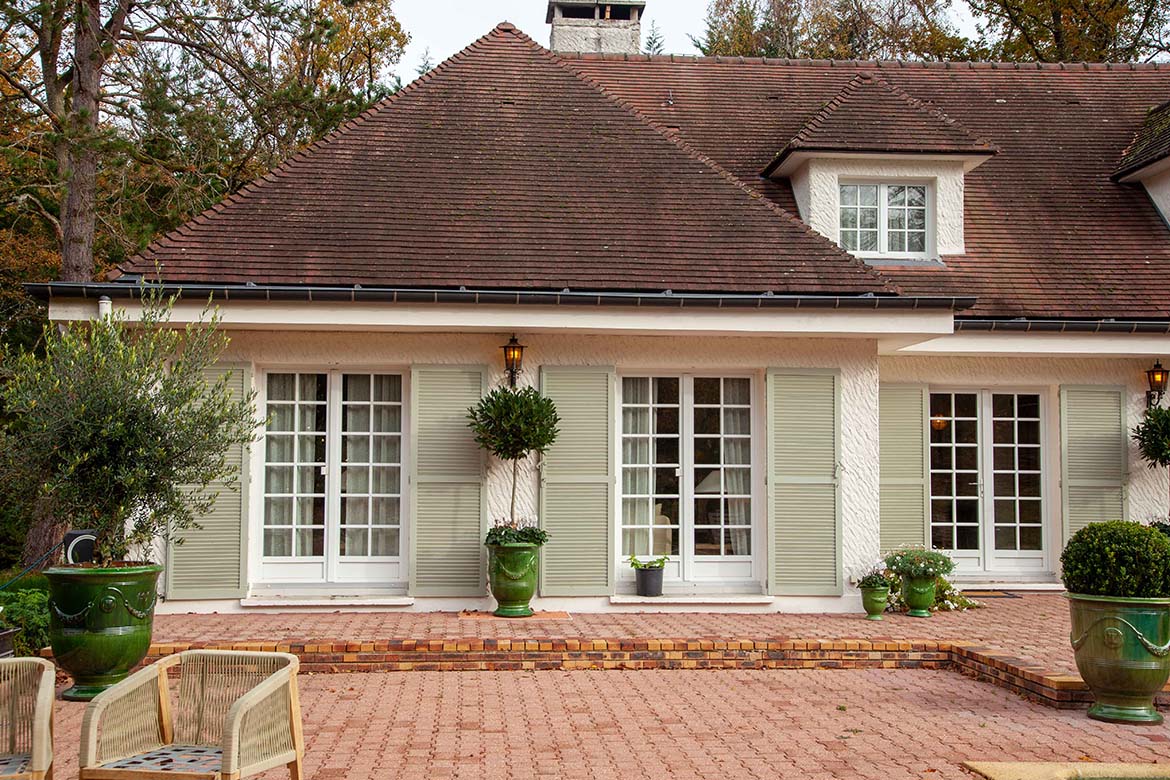 Nous avons découvert les Vaux de Cernay un matin de décembre, juste après un séjour de Noël à l’Abbaye. L’abbaye était encore plongée dans l’ambiance des fêtes : décorations, chaleur du bois, et ce calme particulier propre à l’hiver en forêt. En repartant, il faisait un soleil incroyable pour la saison. La rosée du matin recouvrait encore le sol, et les rayons traversaient les arbres de la forêt domaniale de Rambouillet, donnant à la route une lumière presque cinématographique. Lorsque nous sommes arrivés à la maison, la première chose qui frappe, c’est le terrain. L’espace. Les grands arbres. La façon dont la maison est posée dans la nature, avec la forêt tout autour. On sent immédiatement une respiration, une ouverture, quelque chose de rare si proche de Paris.