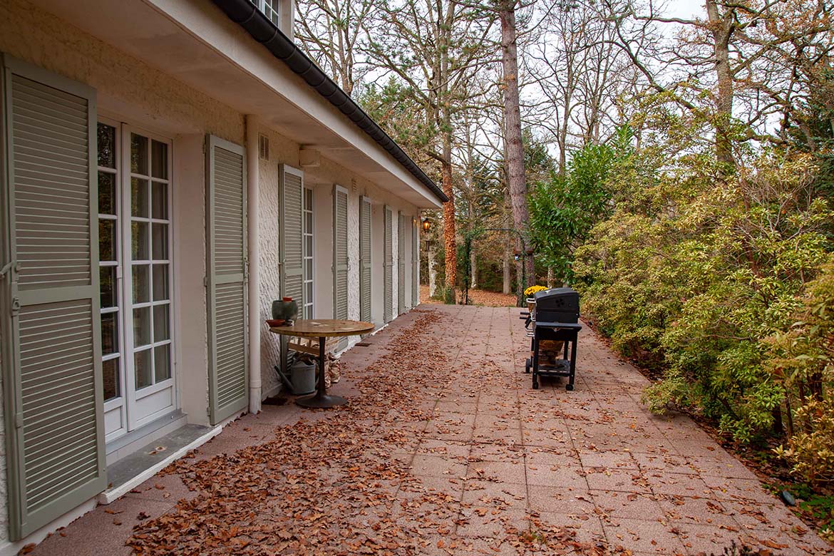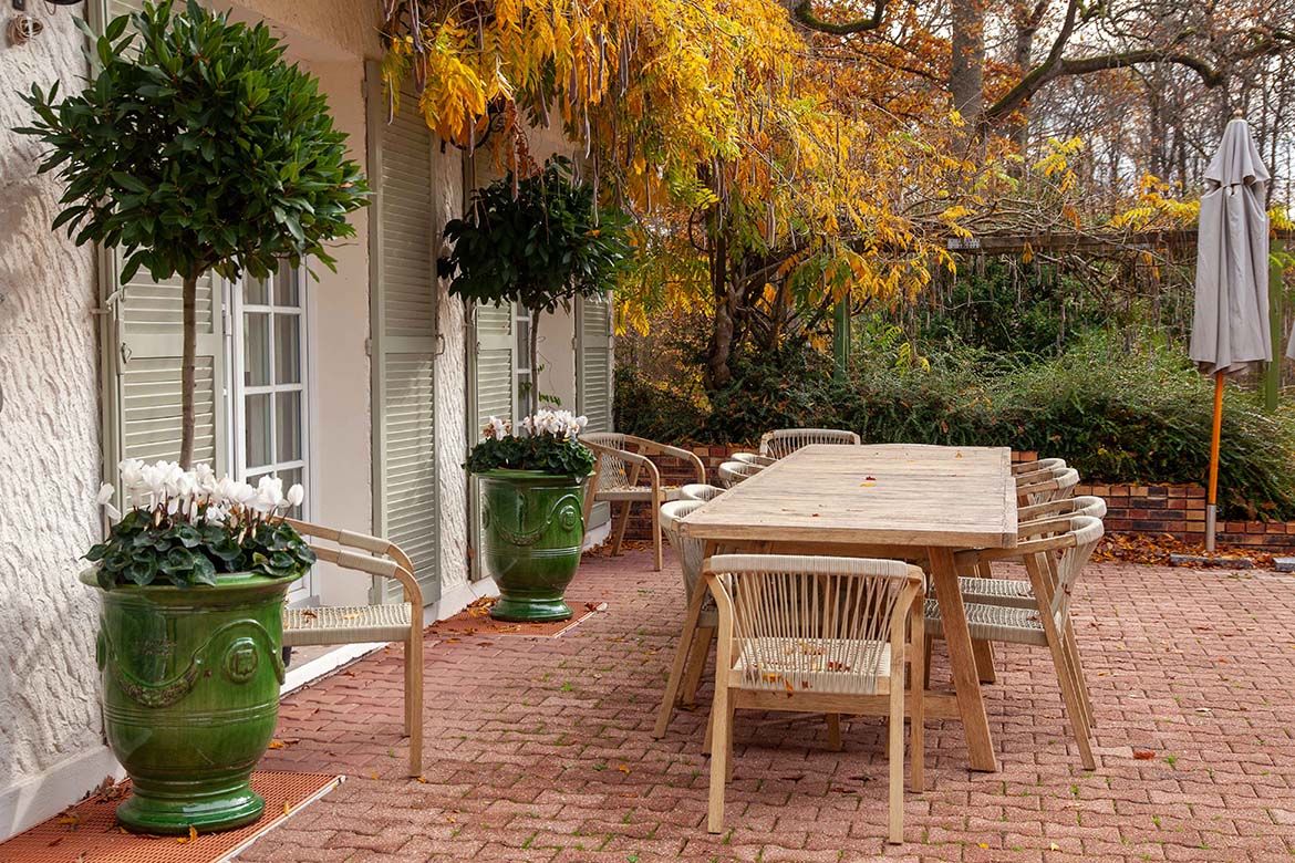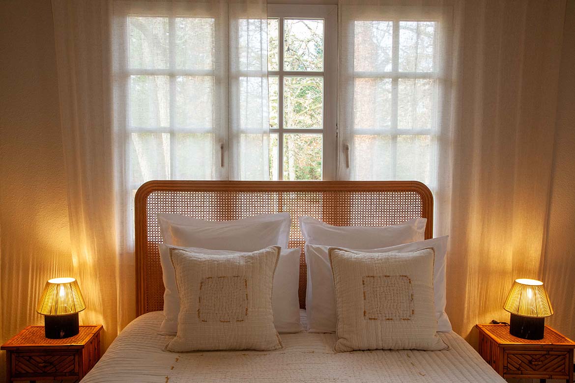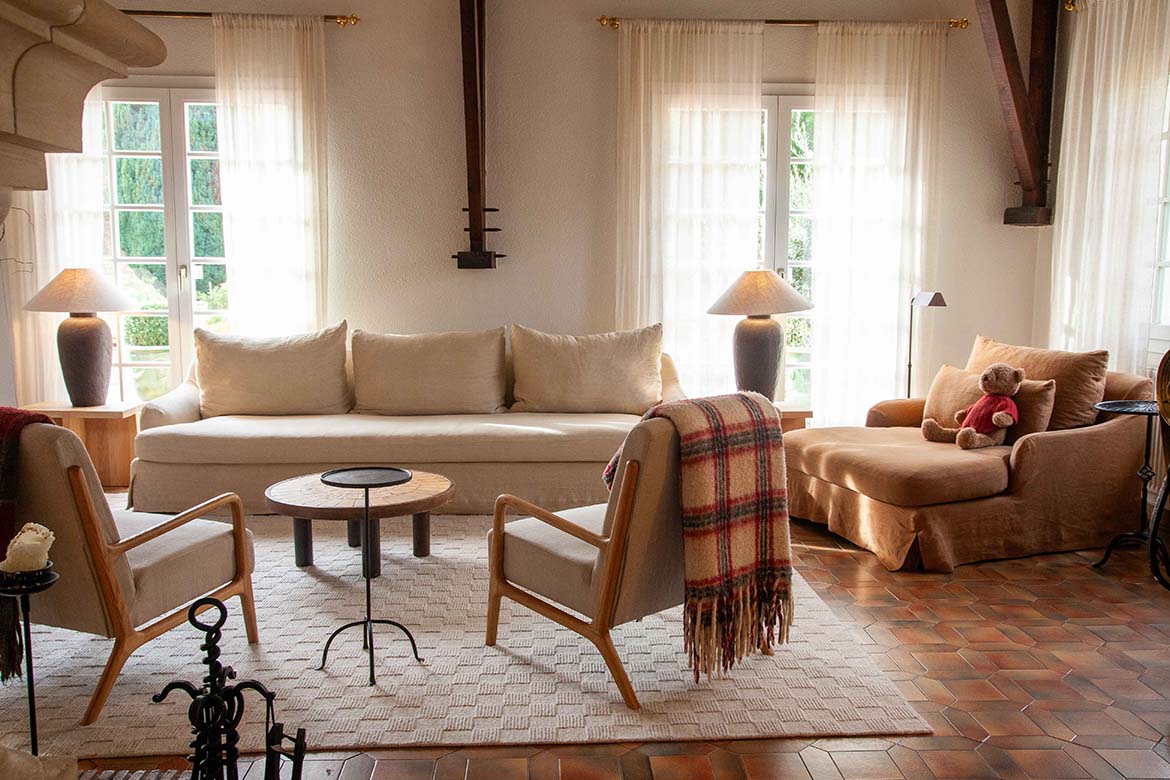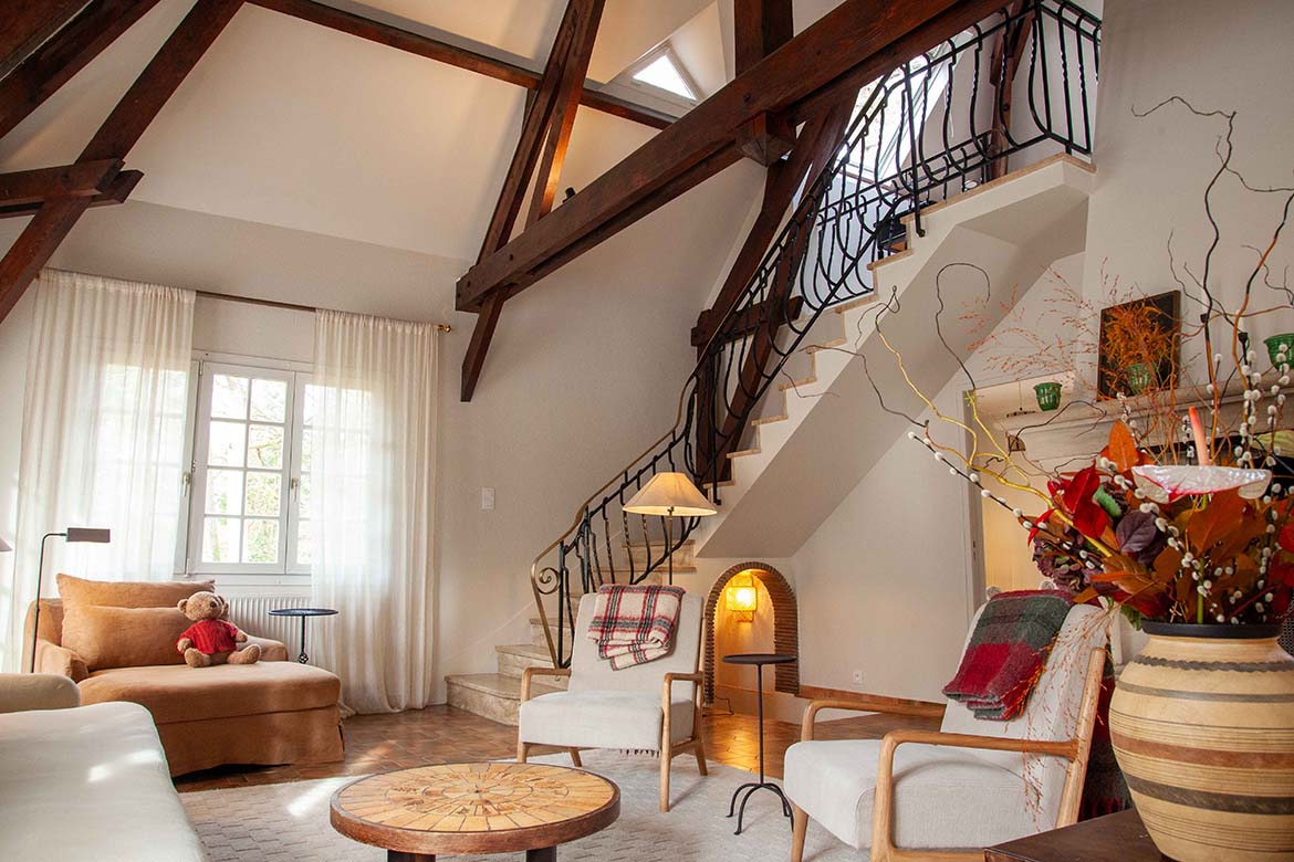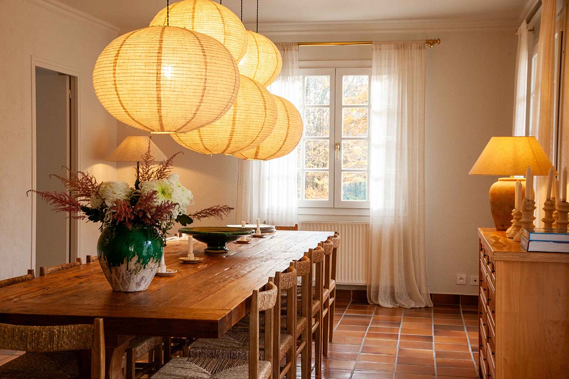 Nous avons découvert les Vaux de Cernay un matin de décembre, juste après un séjour de Noël à l’Abbaye. L’abbaye était encore plongée dans l’ambiance des fêtes : décorations, chaleur du bois, et ce calme particulier propre à l’hiver en forêt. En repartant, il faisait un soleil incroyable pour la saison. La rosée du matin recouvrait encore le sol, et les rayons traversaient les arbres de la forêt domaniale de Rambouillet, donnant à la route une lumière presque cinématographique. Lorsque nous sommes arrivés à la maison, la première chose qui frappe, c’est le terrain. L’espace. Les grands arbres. La façon dont la maison est posée dans la nature, avec la forêt tout autour. On sent immédiatement une respiration, une ouverture, quelque chose de rare si proche de Paris.