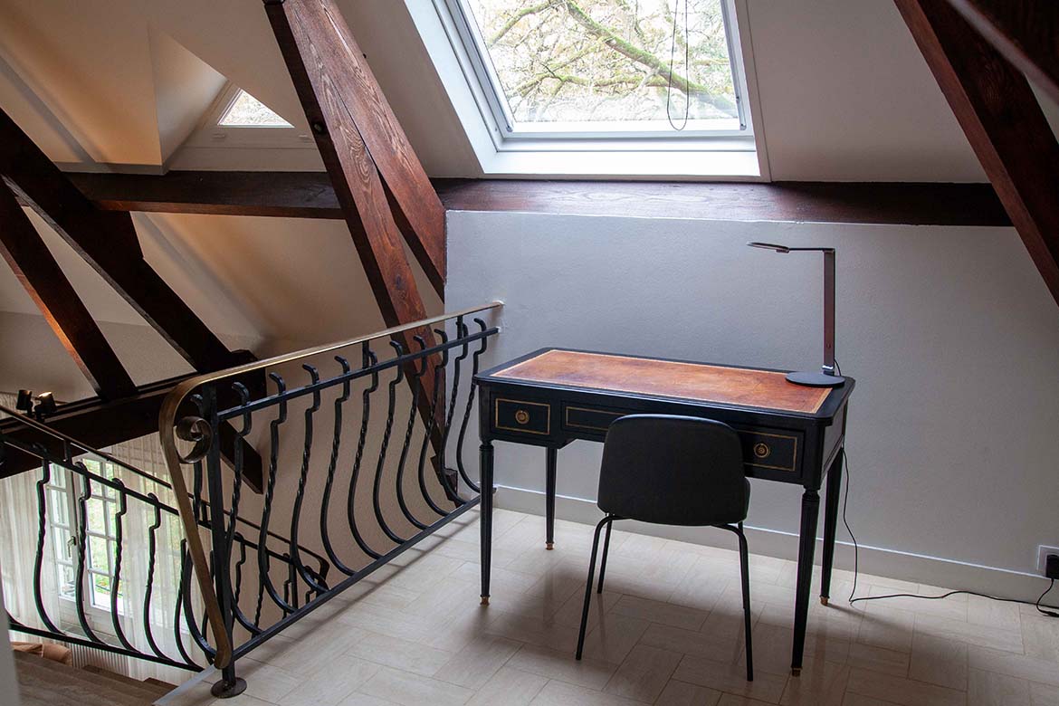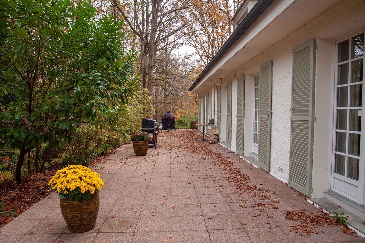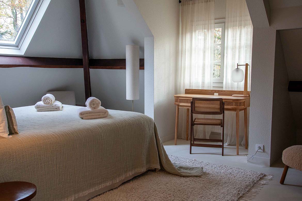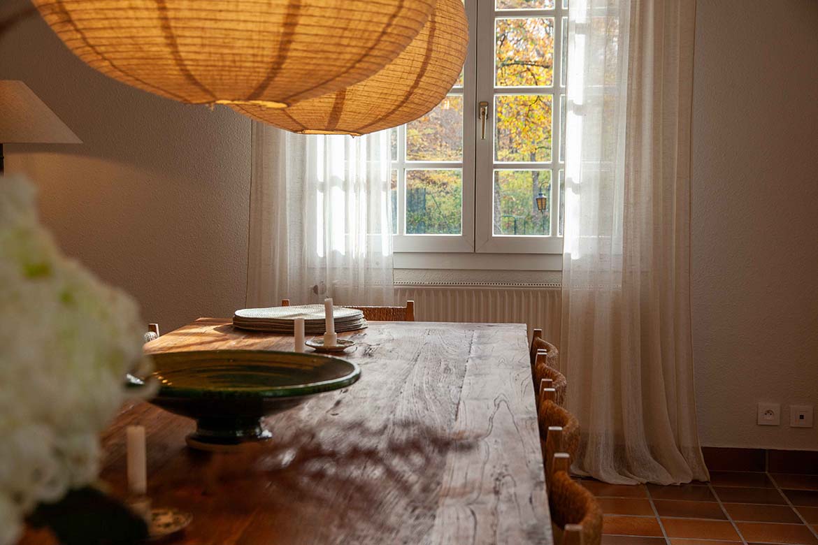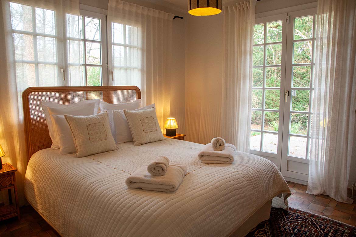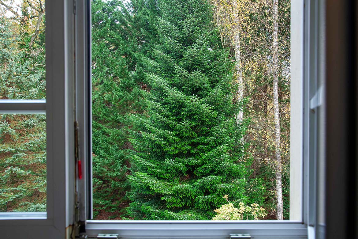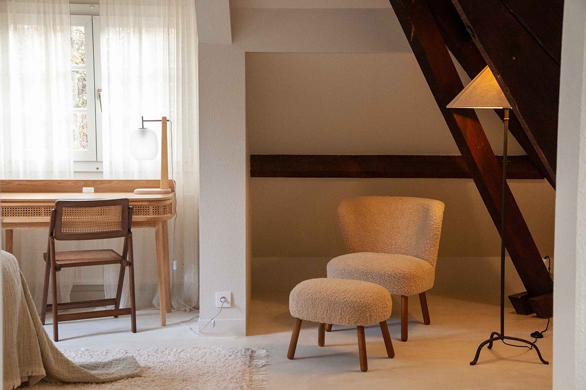 Nous avons découvert les Vaux de Cernay un matin de décembre, juste après un séjour de Noël à l’Abbaye. L’abbaye était encore plongée dans l’ambiance des fêtes : décorations, chaleur du bois, et ce calme particulier propre à l’hiver en forêt. En repartant, il faisait un soleil incroyable pour la saison. La rosée du matin recouvrait encore le sol, et les rayons traversaient les arbres de la forêt domaniale de Rambouillet, donnant à la route une lumière presque cinématographique. Lorsque nous sommes arrivés à la maison, la première chose qui frappe, c’est le terrain. L’espace. Les grands arbres. La façon dont la maison est posée dans la nature, avec la forêt tout autour. On sent immédiatement une respiration, une ouverture, quelque chose de rare si proche de Paris.