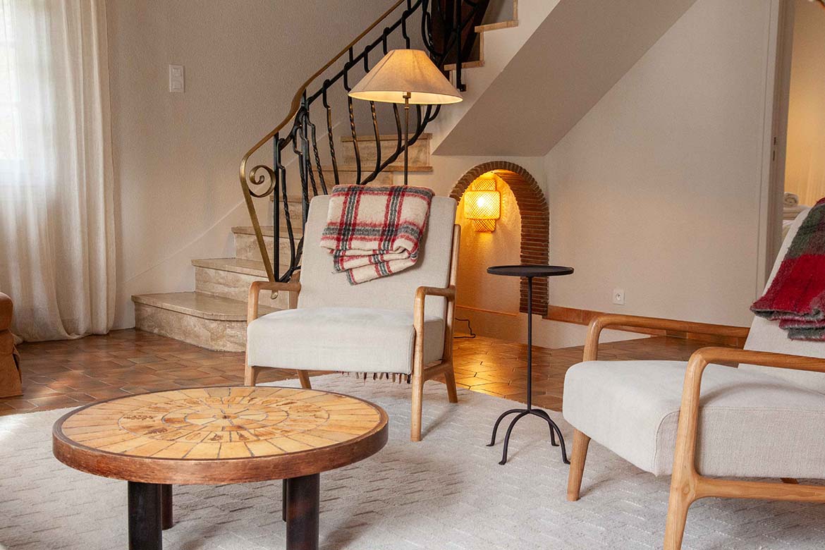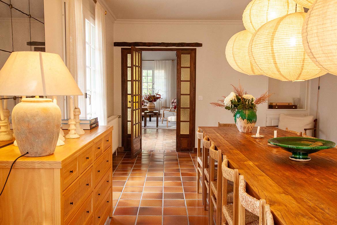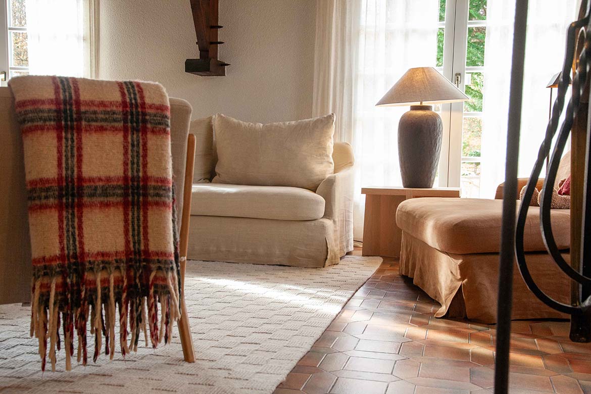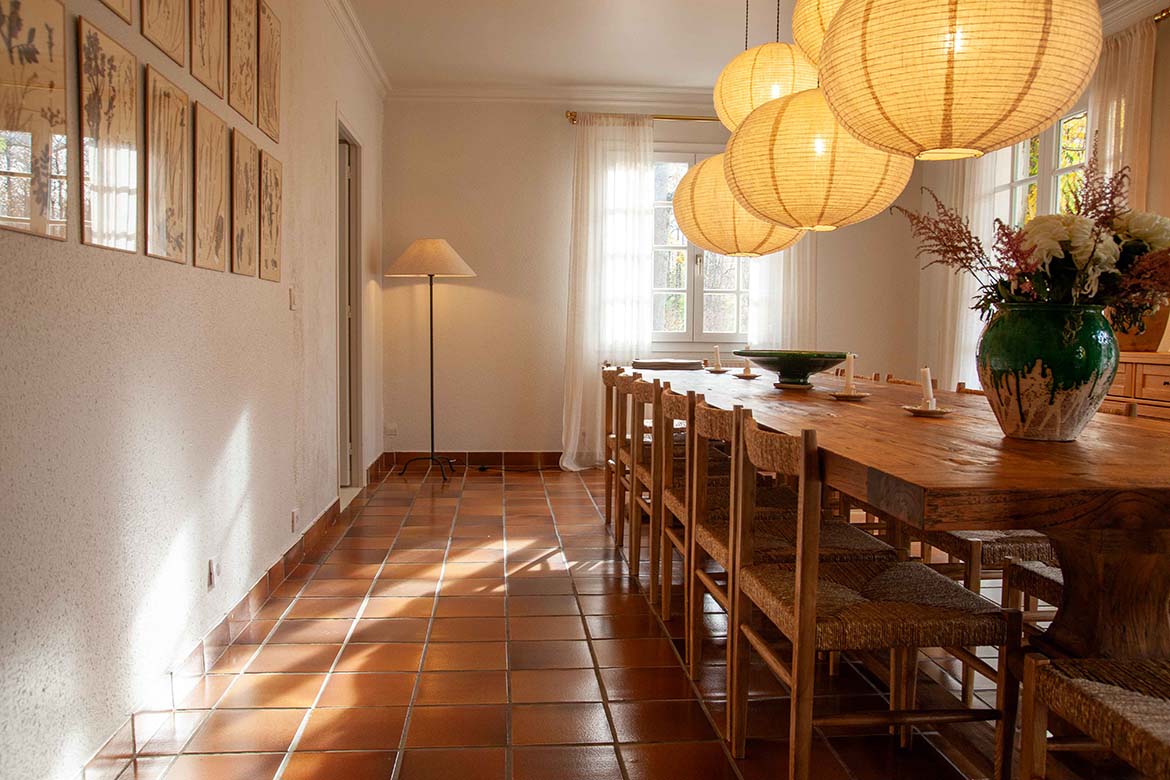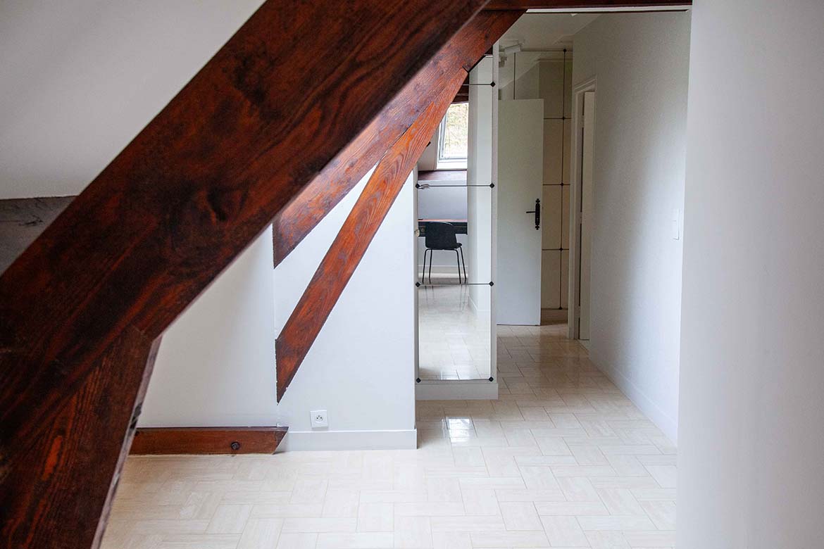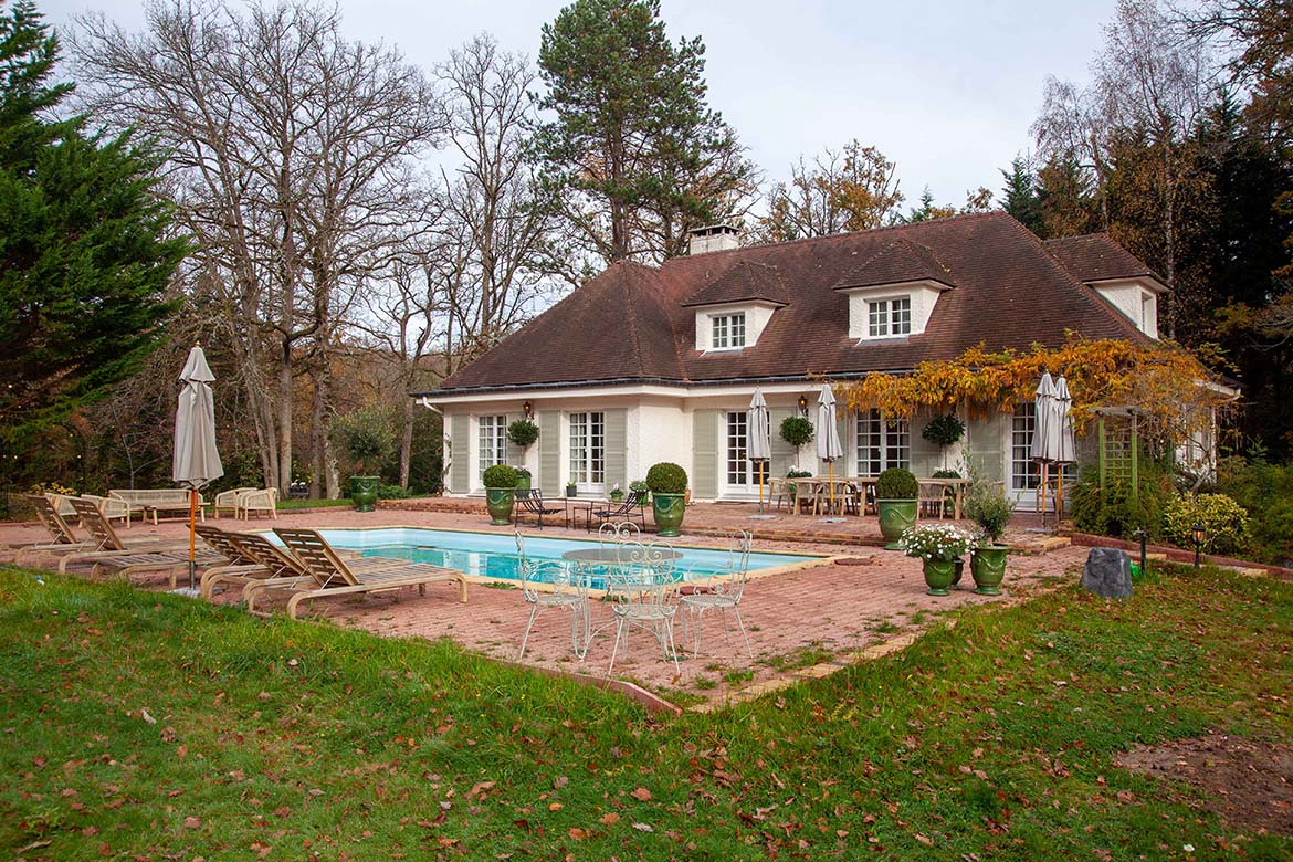 Nous avons découvert les Vaux de Cernay un matin de décembre, juste après un séjour de Noël à l’Abbaye. L’abbaye était encore plongée dans l’ambiance des fêtes : décorations, chaleur du bois, et ce calme particulier propre à l’hiver en forêt. En repartant, il faisait un soleil incroyable pour la saison. La rosée du matin recouvrait encore le sol, et les rayons traversaient les arbres de la forêt domaniale de Rambouillet, donnant à la route une lumière presque cinématographique. Lorsque nous sommes arrivés à la maison, la première chose qui frappe, c’est le terrain. L’espace. Les grands arbres. La façon dont la maison est posée dans la nature, avec la forêt tout autour. On sent immédiatement une respiration, une ouverture, quelque chose de rare si proche de Paris.