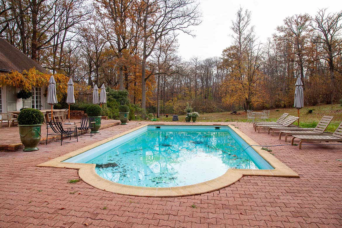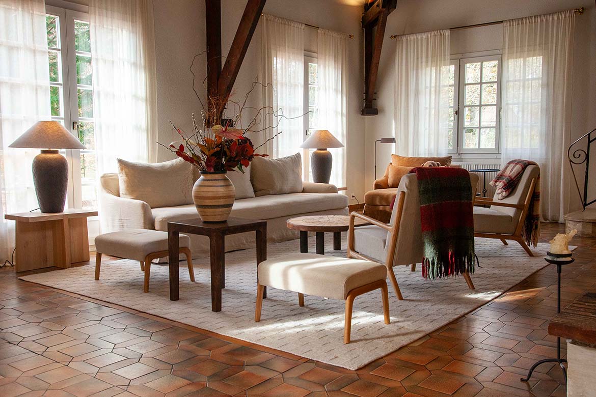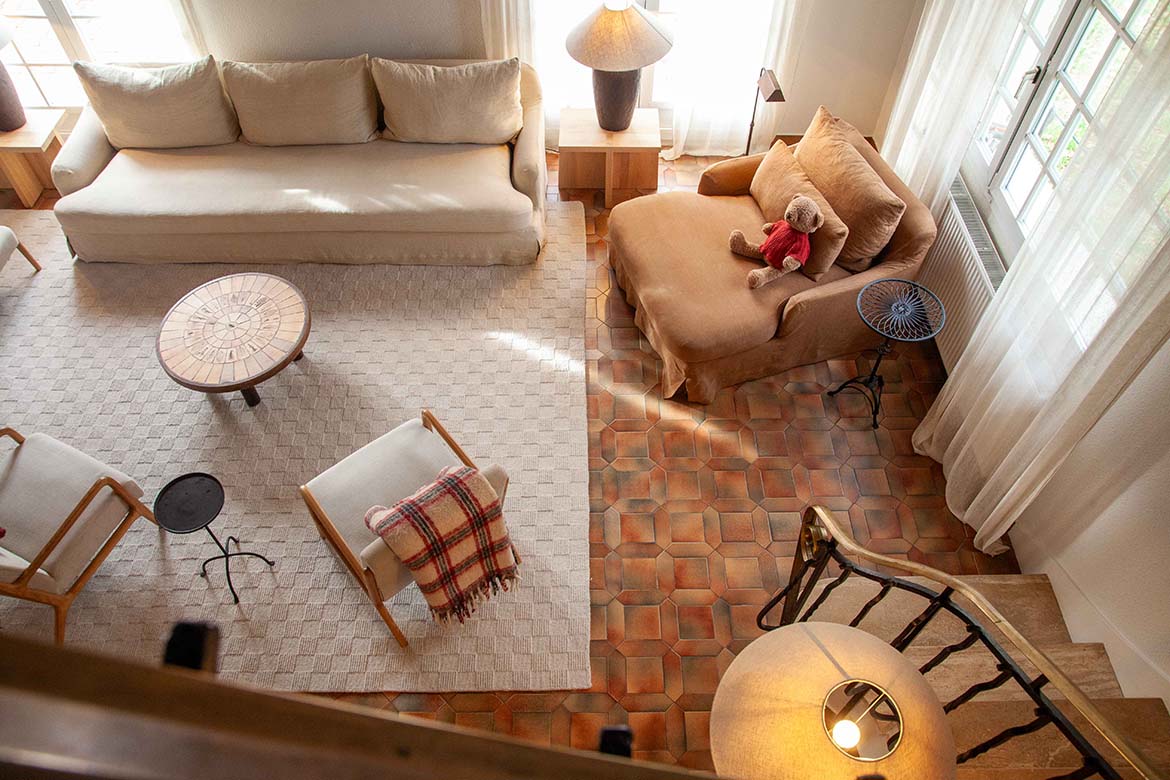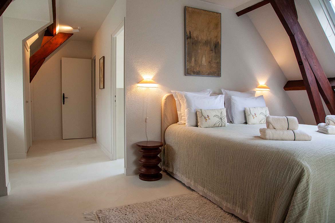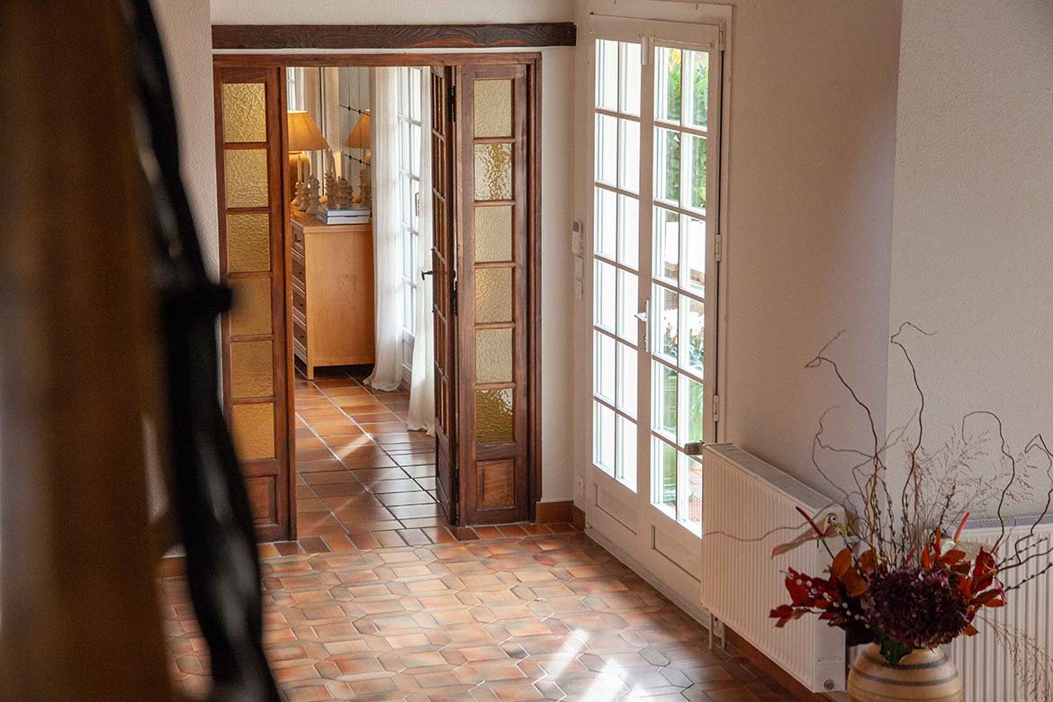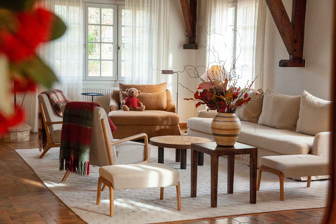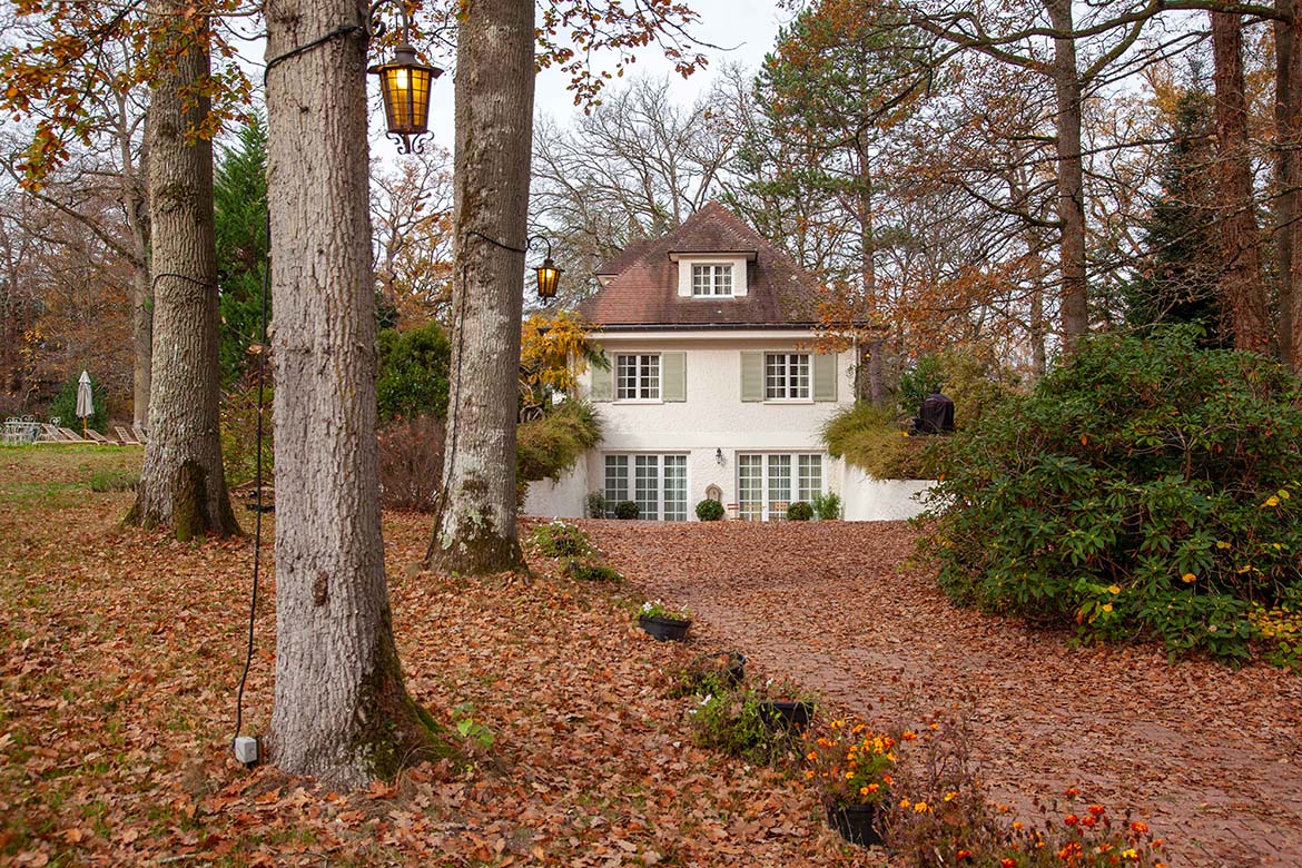 Nous avons découvert les Vaux de Cernay un matin de décembre, juste après un séjour de Noël à l’Abbaye. L’abbaye était encore plongée dans l’ambiance des fêtes : décorations, chaleur du bois, et ce calme particulier propre à l’hiver en forêt. En repartant, il faisait un soleil incroyable pour la saison. La rosée du matin recouvrait encore le sol, et les rayons traversaient les arbres de la forêt domaniale de Rambouillet, donnant à la route une lumière presque cinématographique. Lorsque nous sommes arrivés à la maison, la première chose qui frappe, c’est le terrain. L’espace. Les grands arbres. La façon dont la maison est posée dans la nature, avec la forêt tout autour. On sent immédiatement une respiration, une ouverture, quelque chose de rare si proche de Paris.