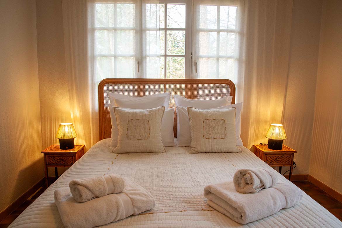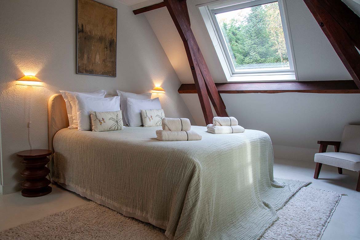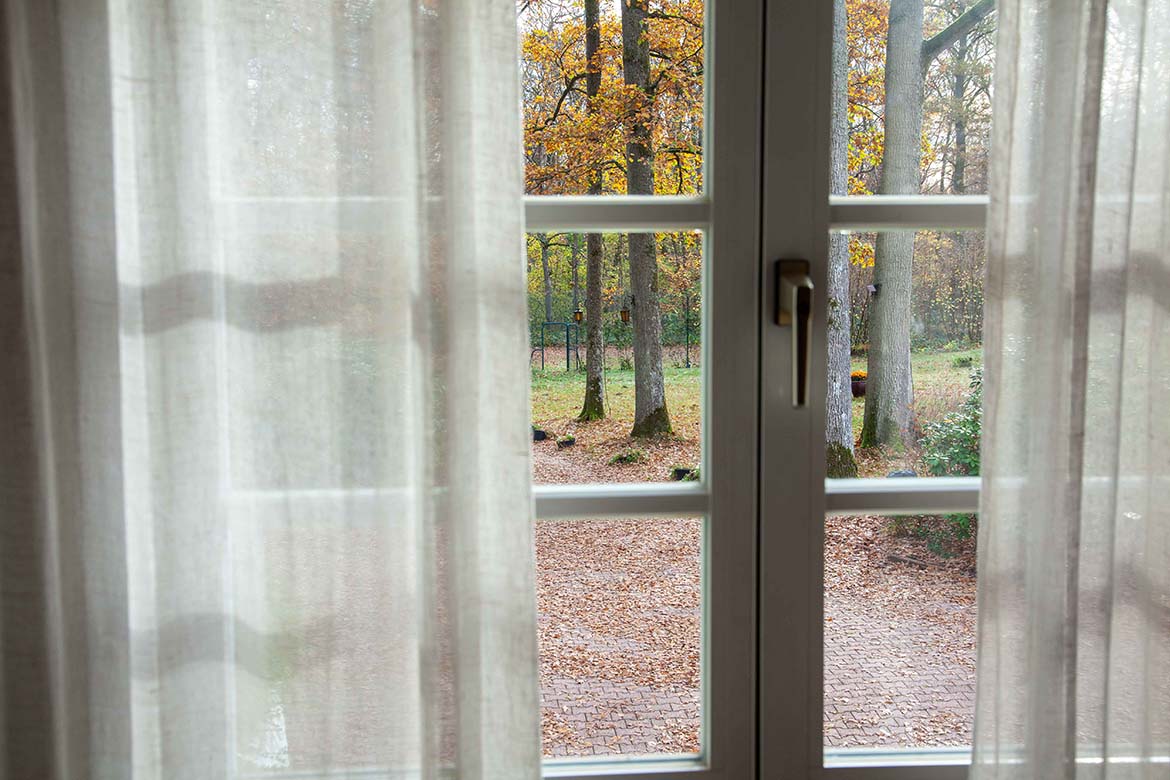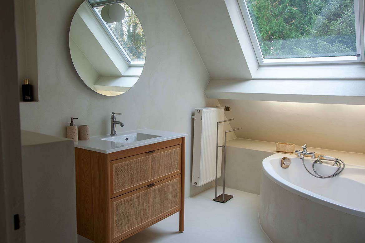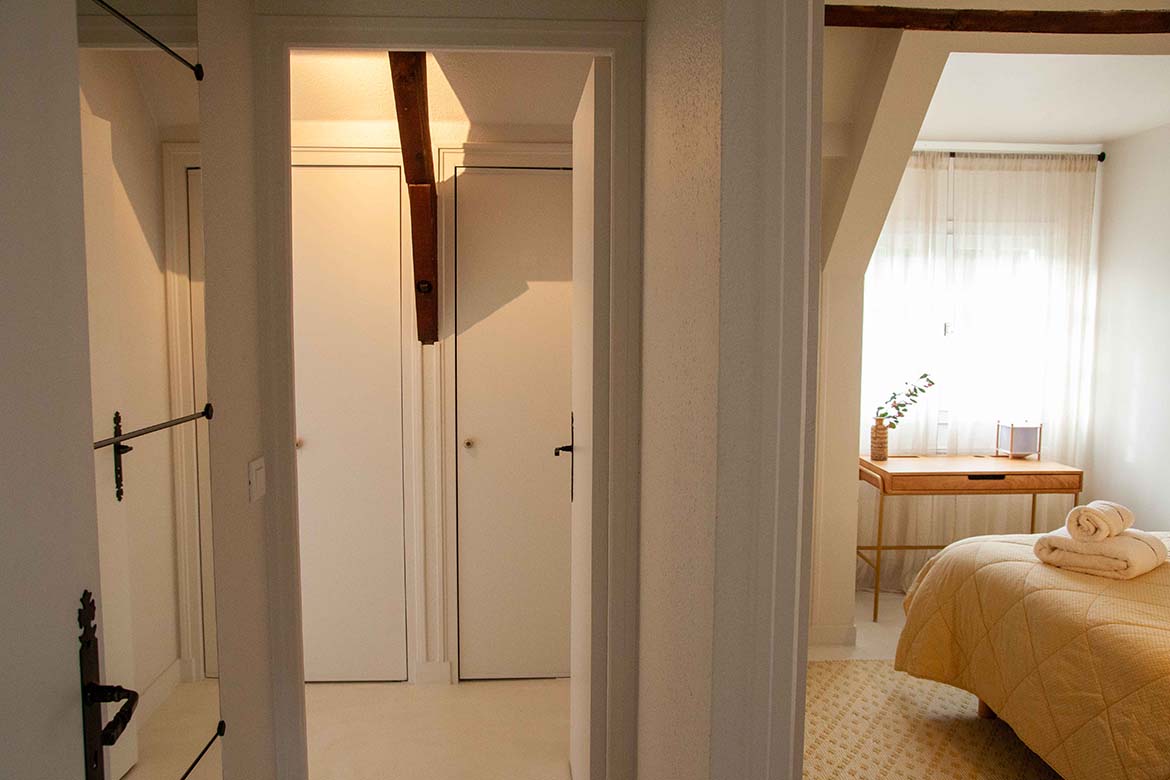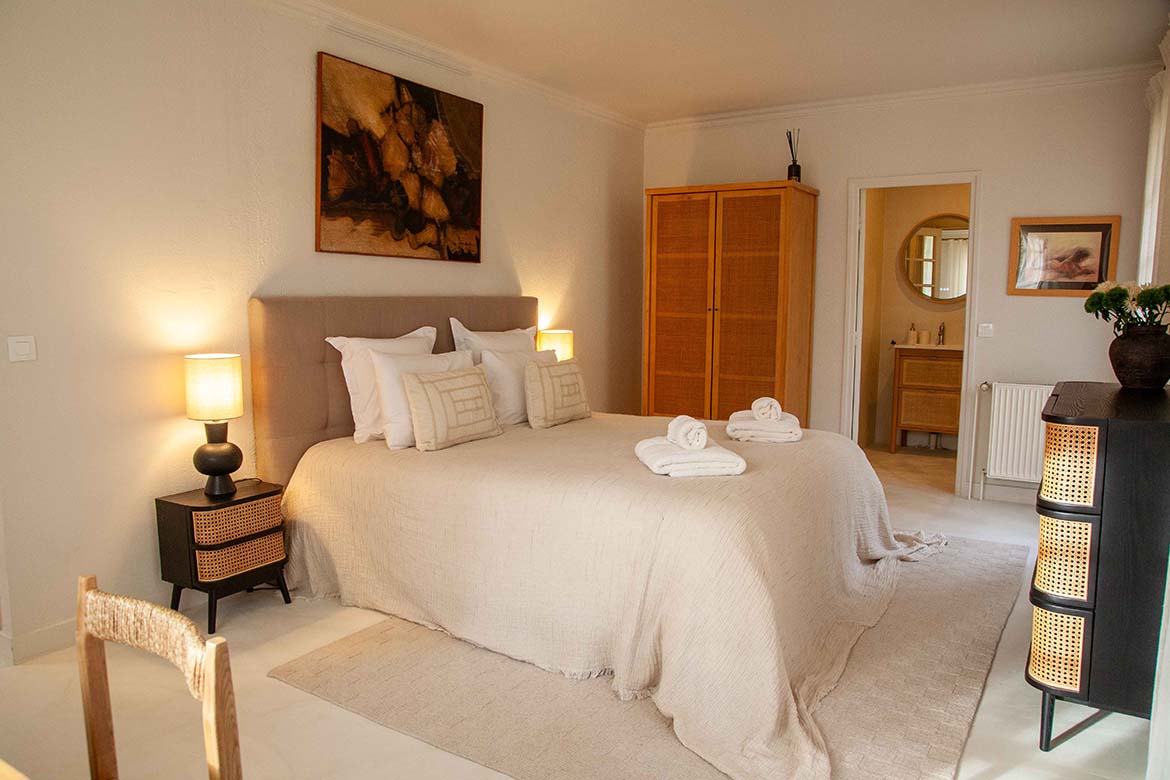 Nous avons découvert les Vaux de Cernay un matin de décembre, juste après un séjour de Noël à l’Abbaye. L’abbaye était encore plongée dans l’ambiance des fêtes : décorations, chaleur du bois, et ce calme particulier propre à l’hiver en forêt. En repartant, il faisait un soleil incroyable pour la saison. La rosée du matin recouvrait encore le sol, et les rayons traversaient les arbres de la forêt domaniale de Rambouillet, donnant à la route une lumière presque cinématographique. Lorsque nous sommes arrivés à la maison, la première chose qui frappe, c’est le terrain. L’espace. Les grands arbres. La façon dont la maison est posée dans la nature, avec la forêt tout autour. On sent immédiatement une respiration, une ouverture, quelque chose de rare si proche de Paris.