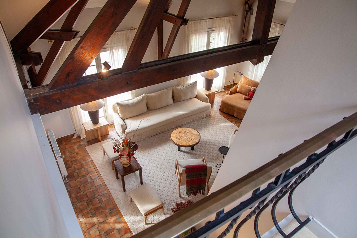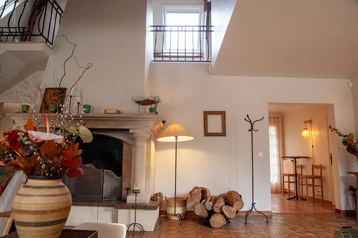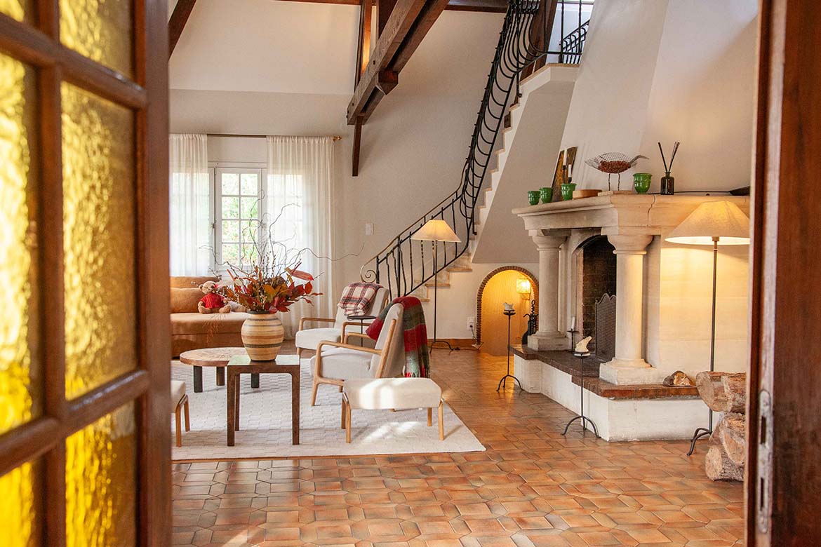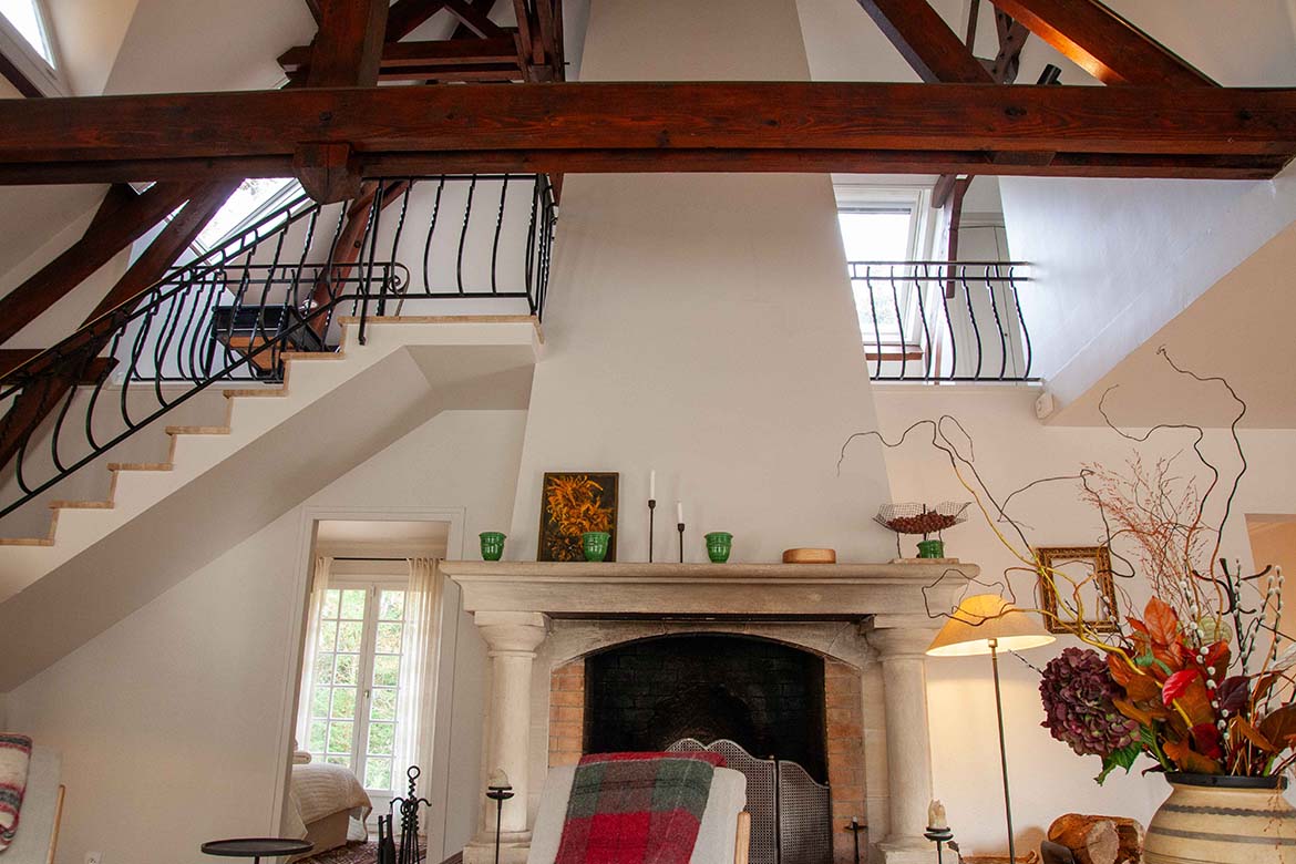 Puis, en entrant, l’atmosphère est encore différente. Ce jour-là, un immense feu crépitait dans la cheminée monumentale. La chaleur, le son du bois qui brûle, la hauteur sous plafond et la lumière qui entrait par les grandes ouvertures formaient un ensemble très fort. La maison dégageait une présence immédiate, comme un décor déjà prêt à être filmé. On s’est projetés sans effort : Noël, les guirlandes, le sapin, la lumière du feu qui se reflète au sol, la forêt visible depuis les fenêtres… À ce moment-là, c’était évident pour nous. La maison avait tout de grands volumes,une luminosité naturelle constante, un terrain entouré d’arbres, une atmosphère chaleureuse et authentique, et surtout, une identité visuelle très marquée.