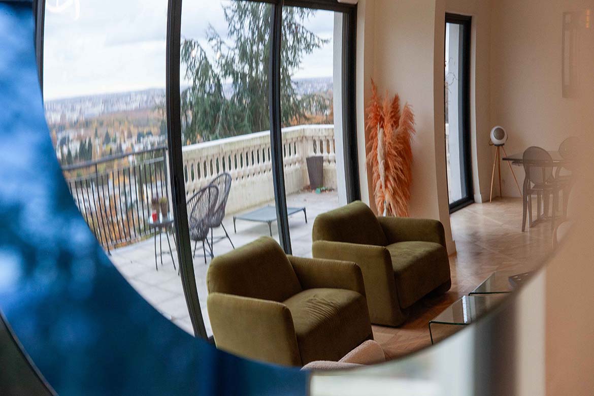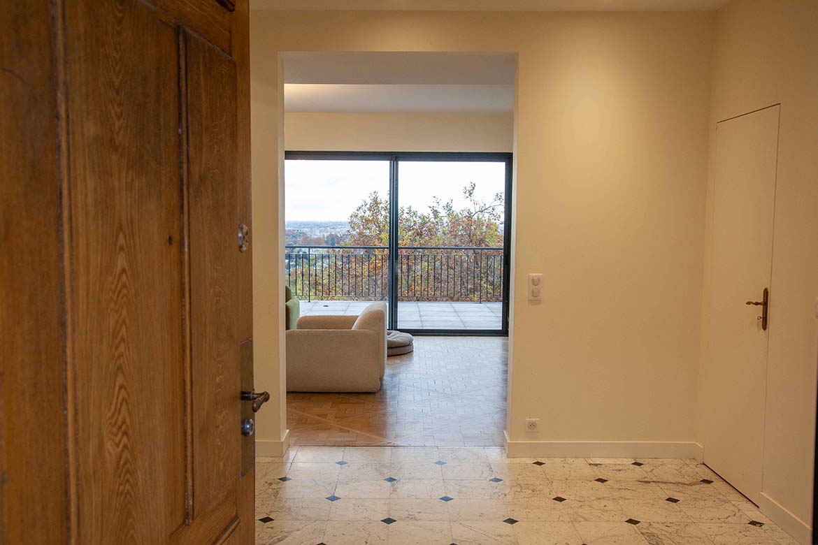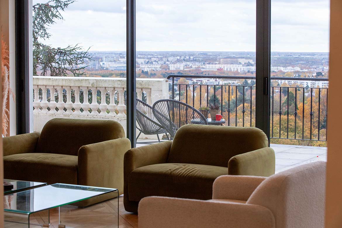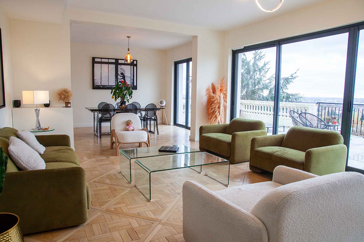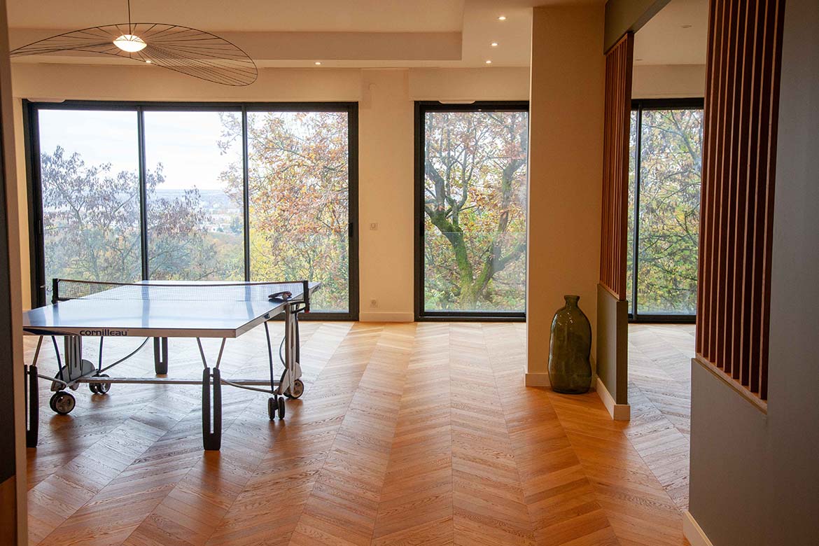 Située dans un quartier résidentiel aux portes de Paris, cette maison de 1975, entièrement rénovée par un architecte, offre une alliance réussie entre authenticité et modernité. D’une surface d’environ 400 m², la propriété se distingue par ses volumes généreux, sa luminosité exceptionnelle, sa vue imprenable et son aménagement pensé dans les moindres détails. Le rez-de-chaussée accueille une vaste pièce de vie traversante de 150 m2, baignée de lumière naturelle grâce à de grandes baies vitrées s’ouvrant sur une terrasse spacieuse de 80 m2, et offrant une vue dégagée spectaculaire. L’espace comprend un salon avec hauteur sous plafond de plus de 3m et parquet ancien, une salle à manger conviviale, une bibliothèque avec sa cheminée fonctionnelle et une cuisine ouverte moderne et entièrement équipée. Le premier étage dessert 3 chambres dont deux chambres d’enfant et une suite parentale avec double dressing et salle de bain privative. Une seconde salle de bain avec baignoire vient compléter cet étage. Au deuxième étage se trouve le bureau et une seconde suite parentale pour les amis.
