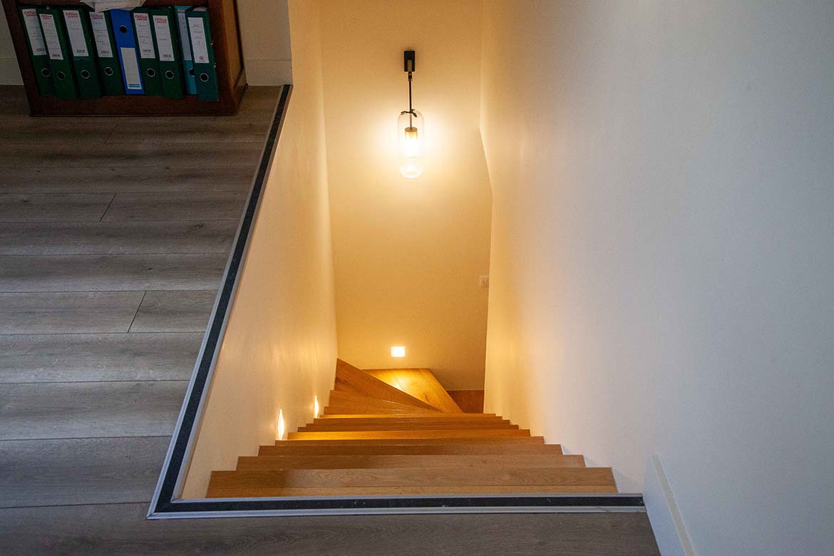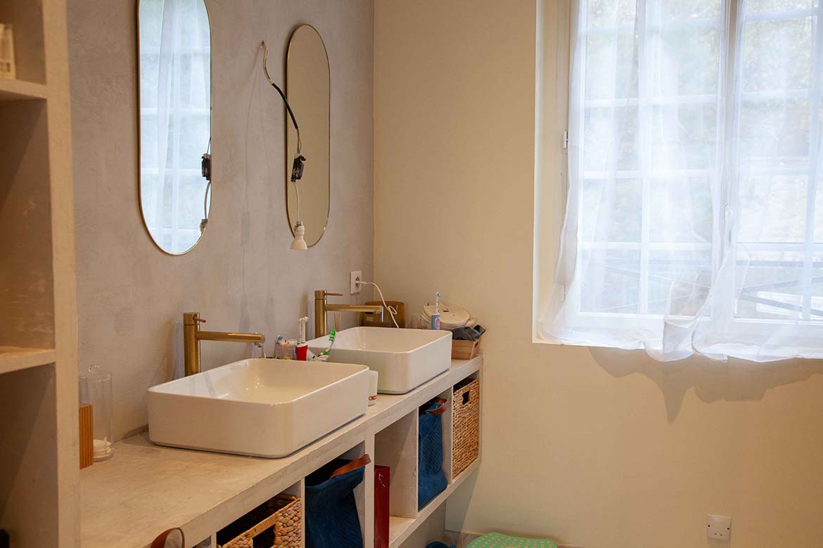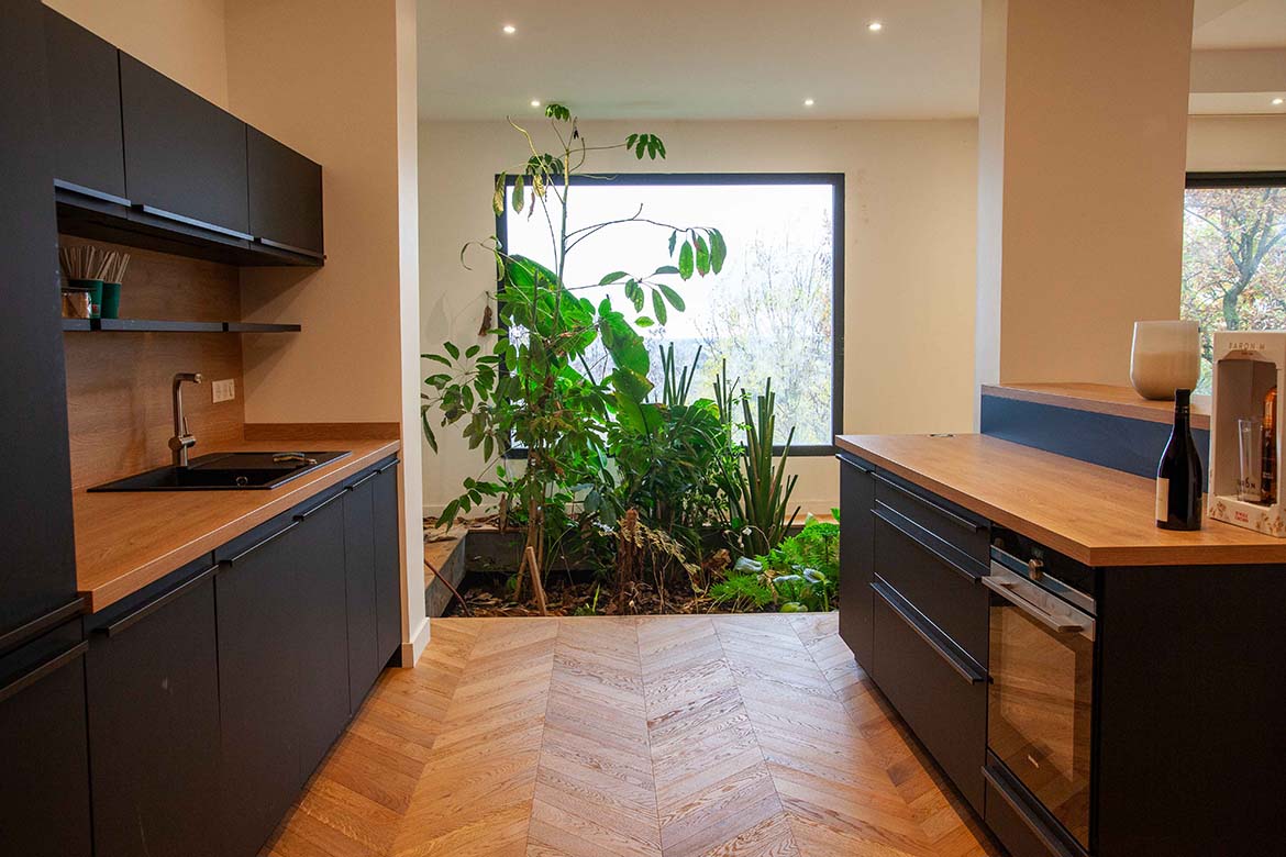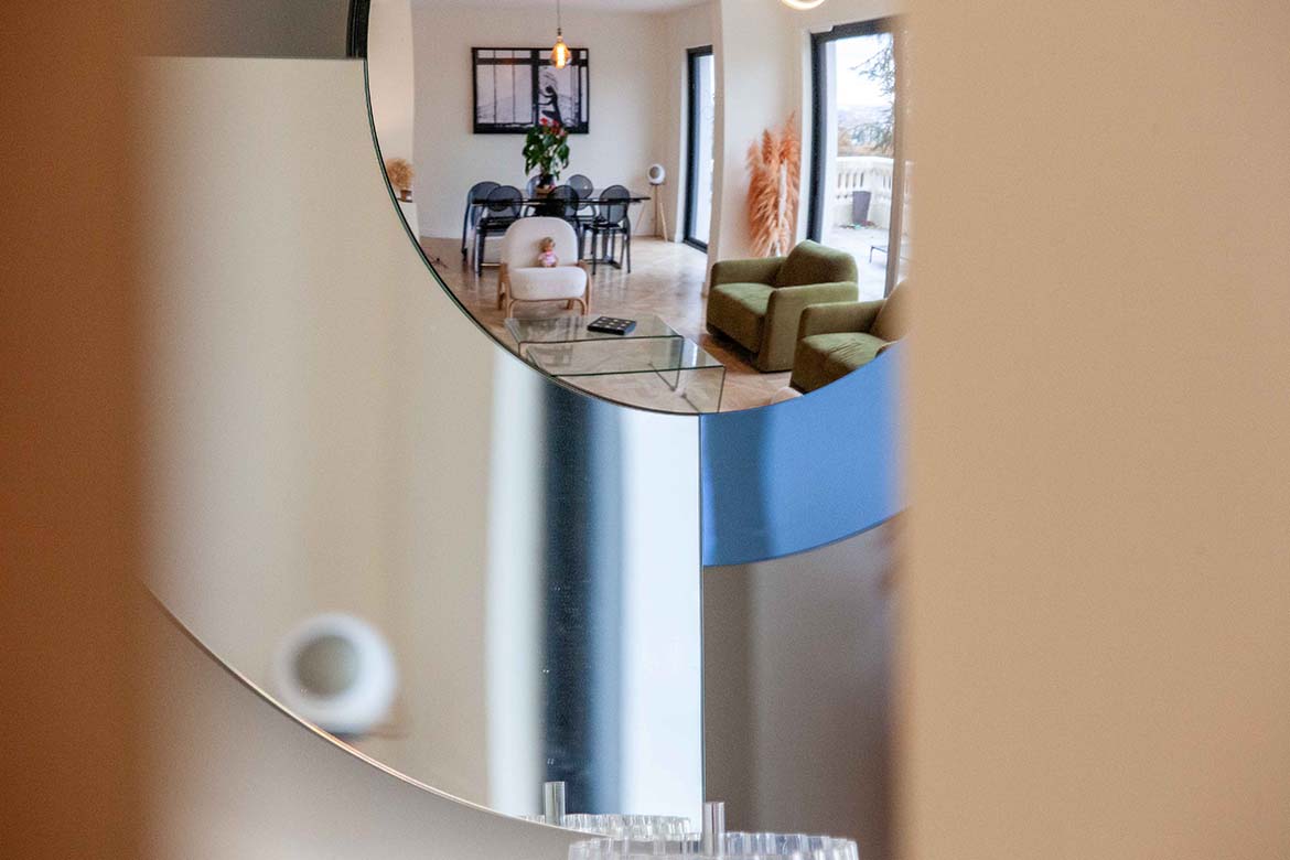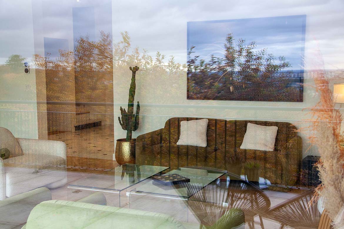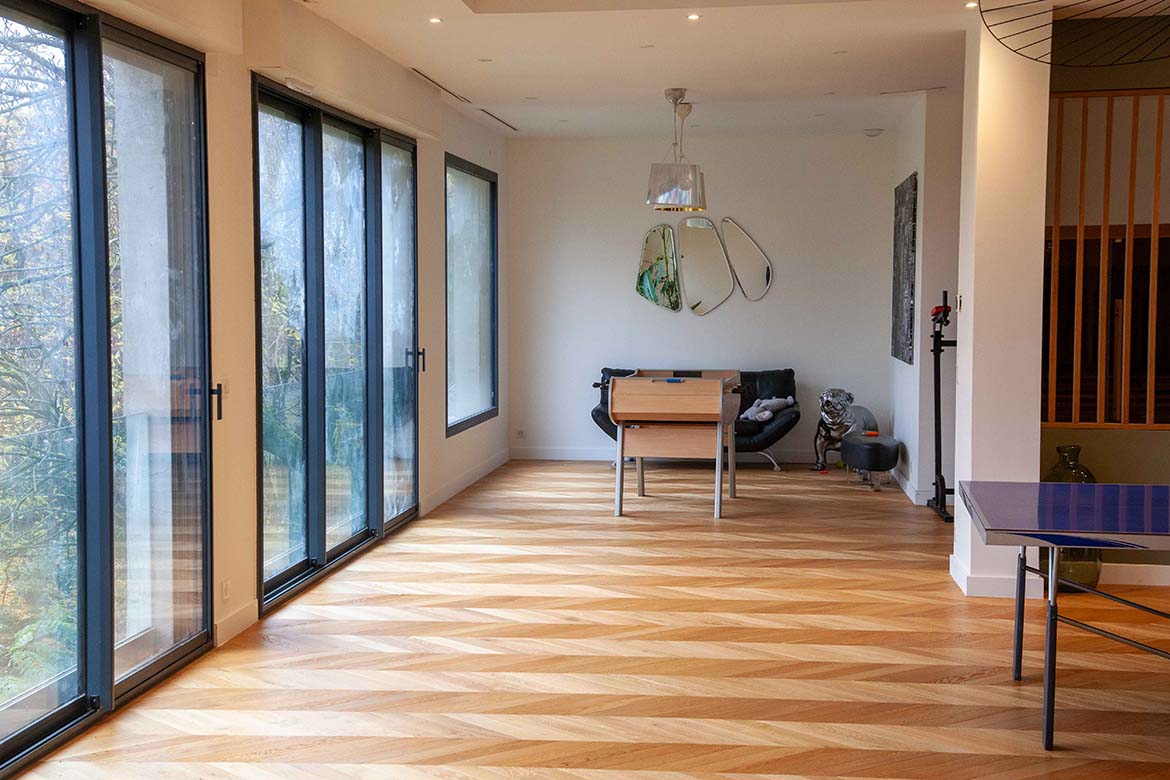 L’ensemble offre un effet “wahou” dès l’entrée, renforcé par la luminosité omniprésente et les perspectives ouvertes sur l’extérieur. Il y a également un garage et un double parking.