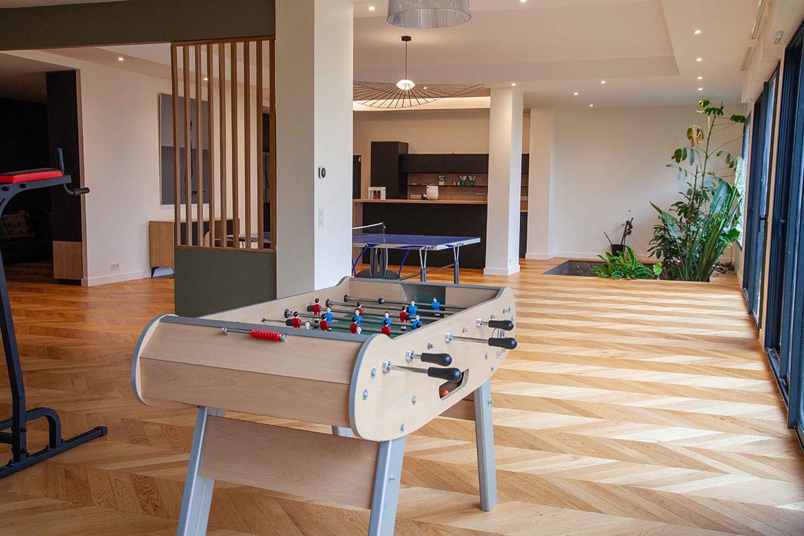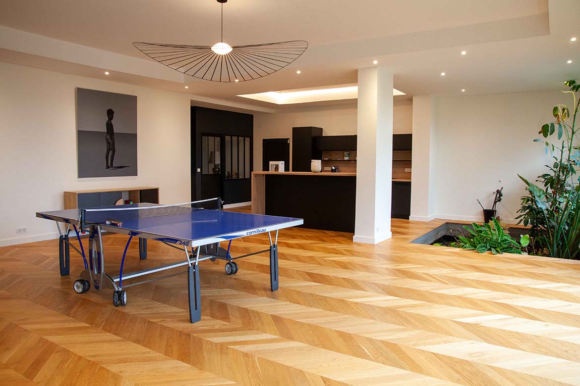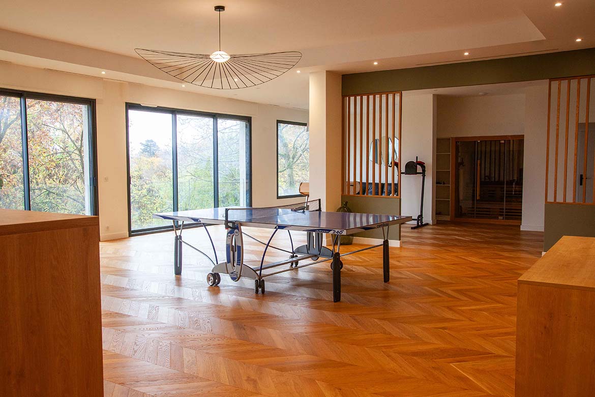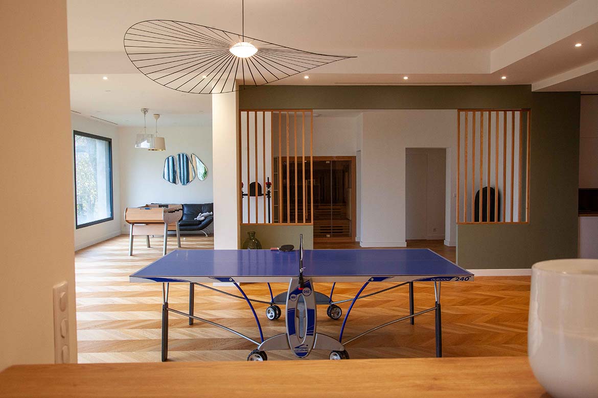La maison comprend un deuxième espace de 200 m2 totalement ouvert sur 3 baies vitrées donnant sur le jardin comprenant salle télé, salon avec cuisine ouverte, salle de jeux, jardin intérieur, sauna et salle de bain.