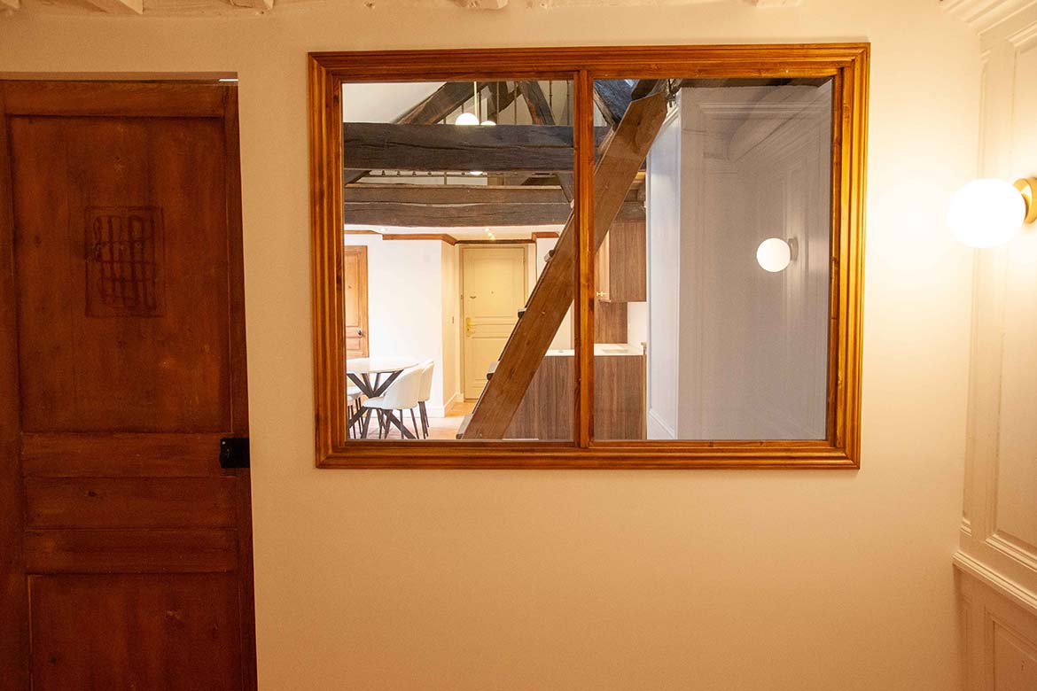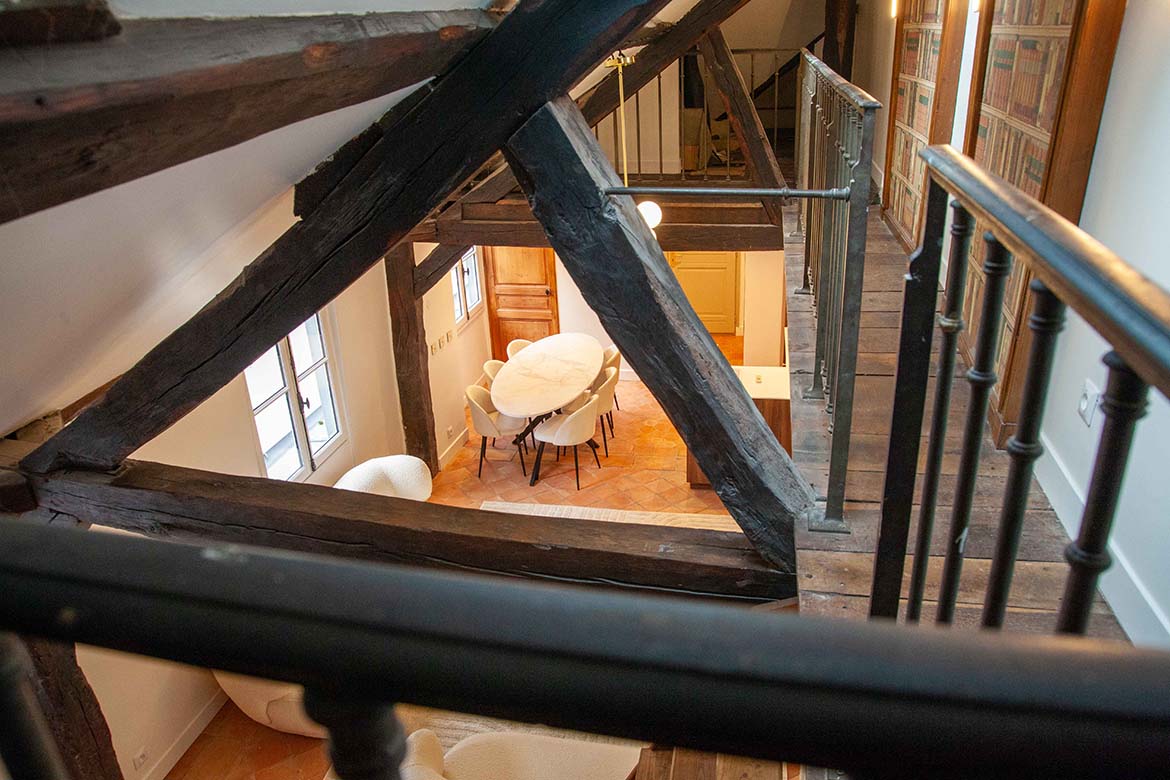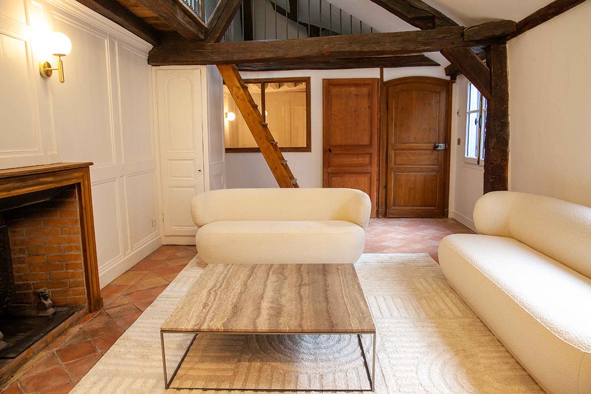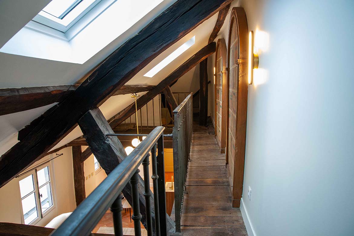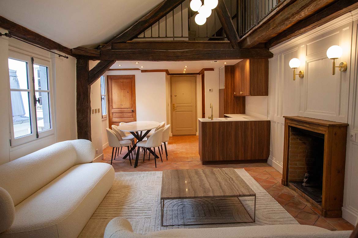 C’est un appartement de 3 pièces, offrant le charme de l’ancien, au 4ème et dernier étage sans ascenseur d’un immeuble ancien bien entretenu, au calme sur cour, rue de Lille. Il se compose d’un spacieux séjour avec une cuisine ouverte aménagée, d’un espace dînatoire, et d’un séjour lumineux, le tout offrant une grande hauteur sous plafond, des velux ainsi que de poutres apparentes, une cheminée en état de fonctionnement ainsi qu’une mezzanine décorative. S’ensuit une première chambre vide avec poutres apparentes peintes et verrière, s’ensuit une deuxième chambre vide avec poutres apparentes, un dressing et rangements et sa salle de bain et de douche avec wc. L’appartement dispose d’une deuxième salle de douche et d’un second wc. A l’étage, la mezzanine décorative offre différents espaces de rangements. Il faut privilégier pour ce décors des tournages en équipes légères