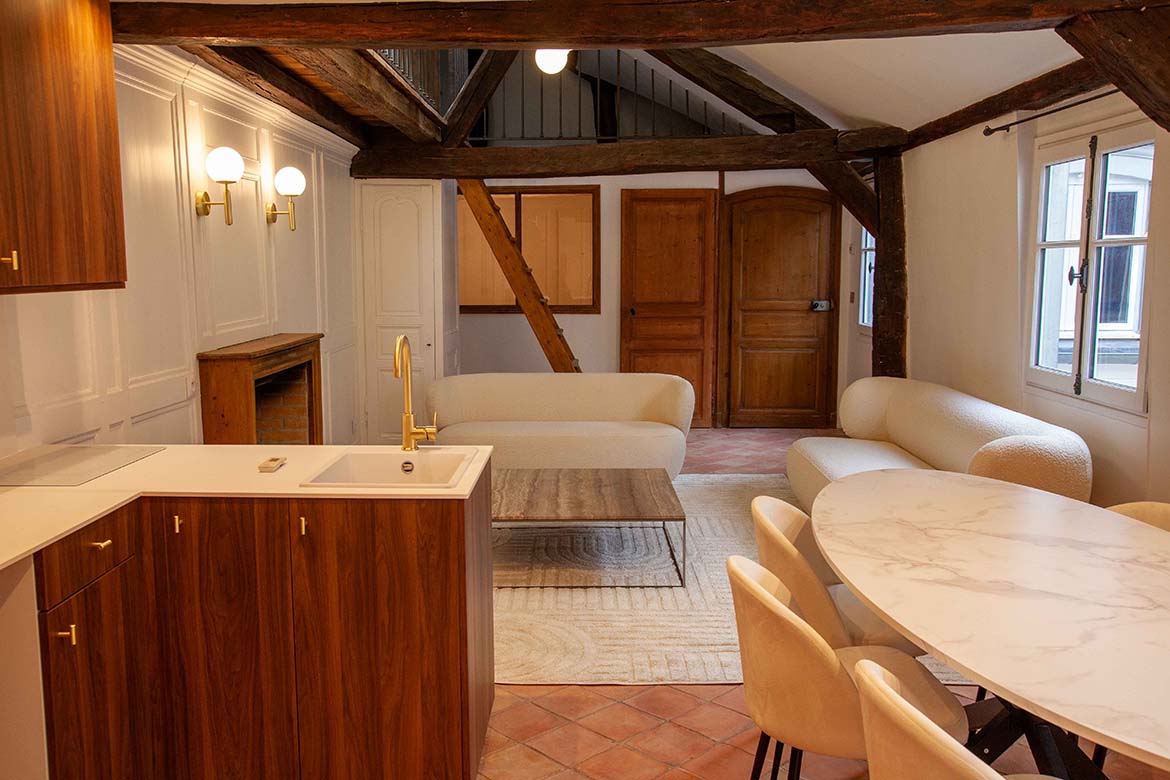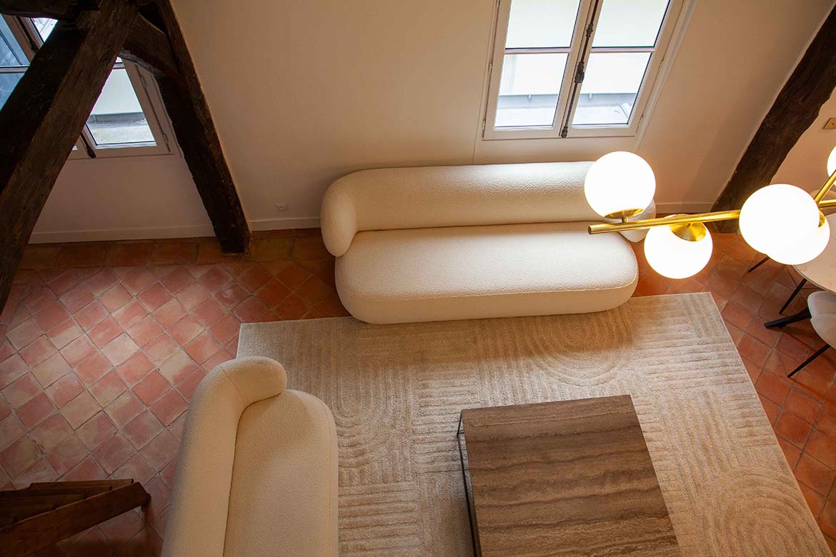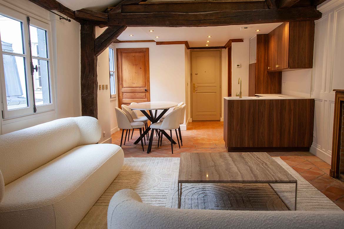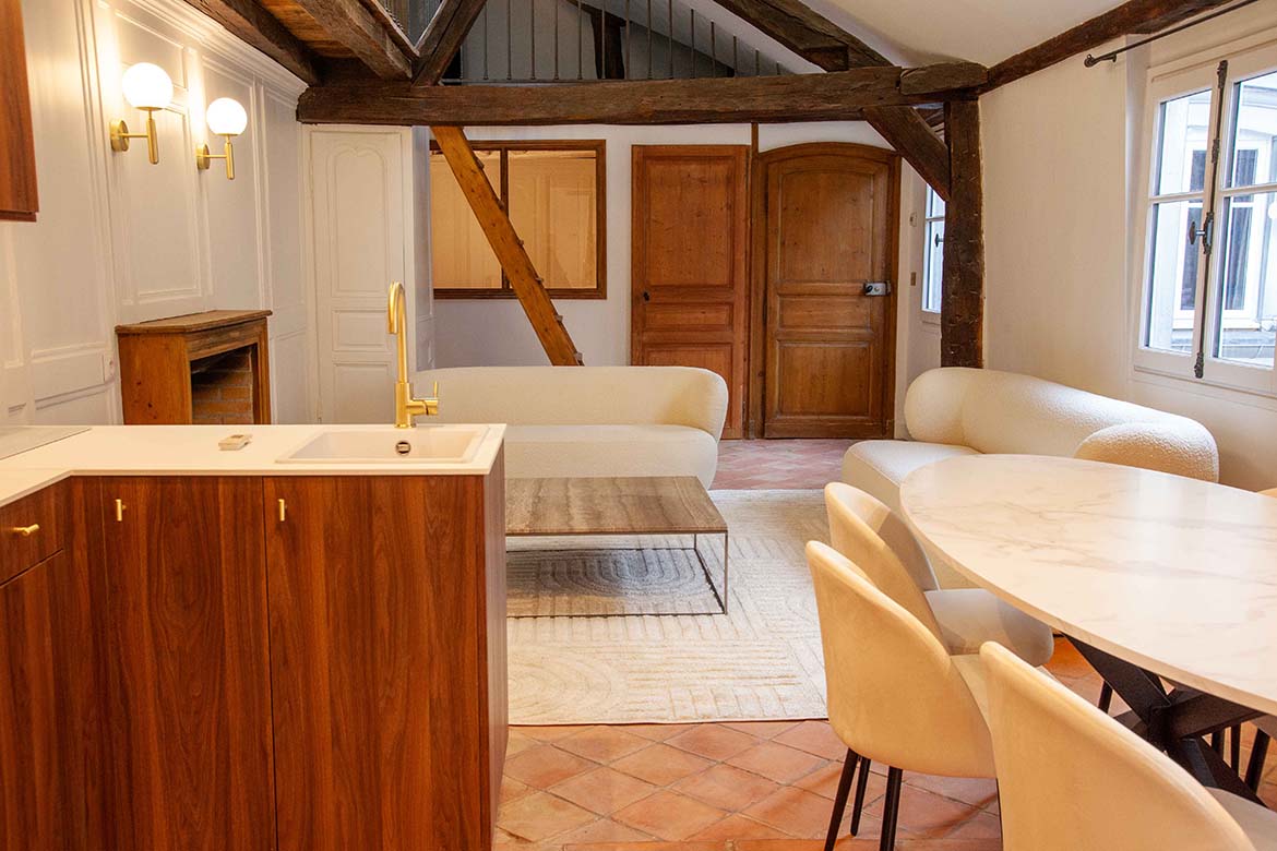 C’est un appartement de 3 pièces, offrant le charme de l’ancien, au 4ème et dernier étage sans ascenseur d’un immeuble ancien bien entretenu, au calme sur cour, rue de Lille. Il se compose d’un spacieux séjour avec une cuisine ouverte aménagée, d’un espace dînatoire, et d’un séjour lumineux, le tout offrant une grande hauteur sous plafond, des velux ainsi que de poutres apparentes, une cheminée en état de fonctionnement ainsi qu’une mezzanine décorative. S’ensuit une première chambre vide avec poutres apparentes peintes et verrière, s’ensuit une deuxième chambre vide avec poutres apparentes, un dressing et rangements et sa salle de bain et de douche avec wc. L’appartement dispose d’une deuxième salle de douche et d’un second wc. A l’étage, la mezzanine décorative offre différents espaces de rangements. Il faut privilégier pour ce décors des tournages en équipes légères